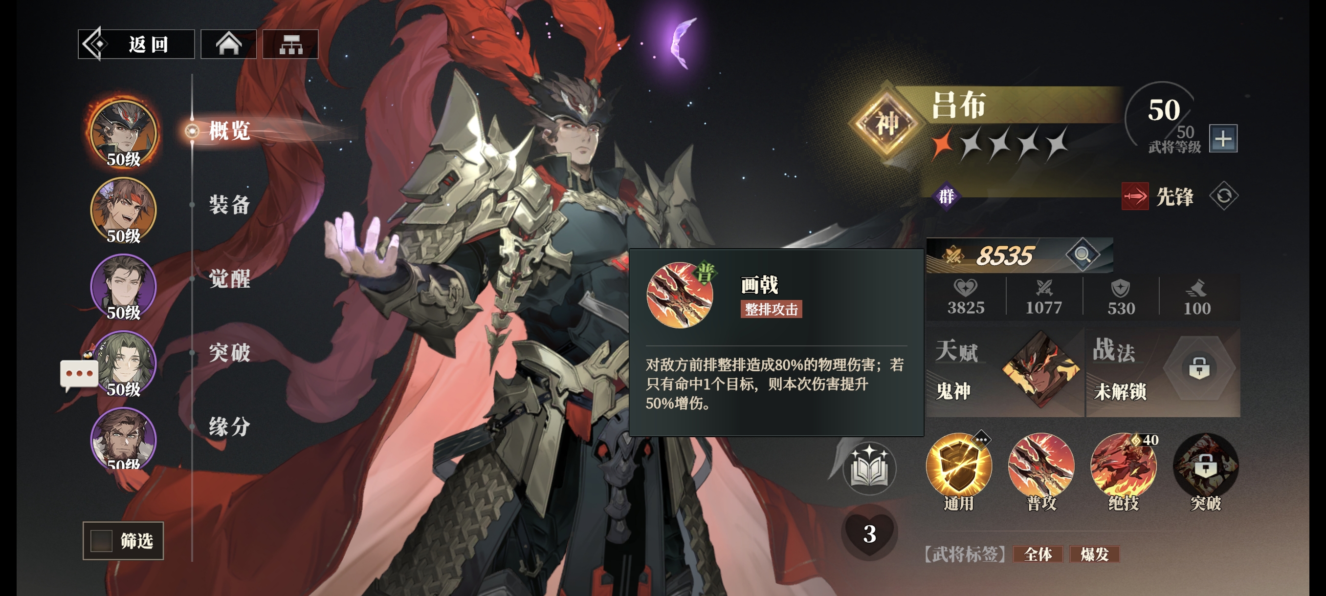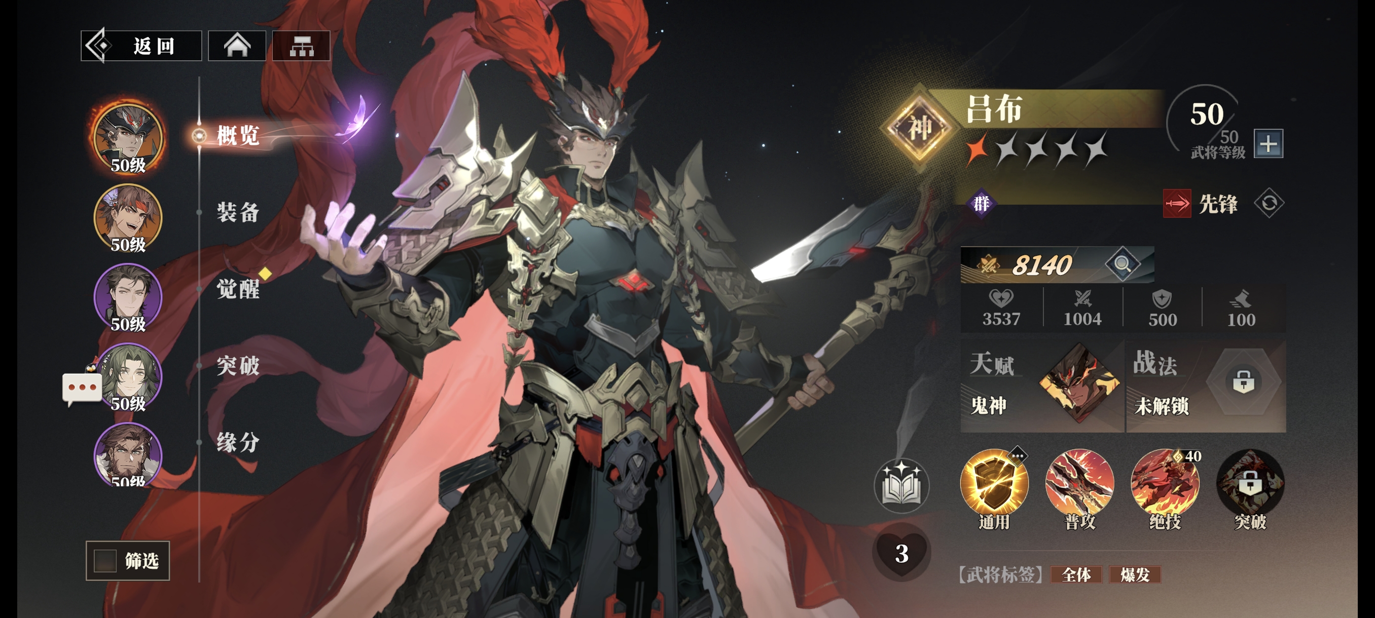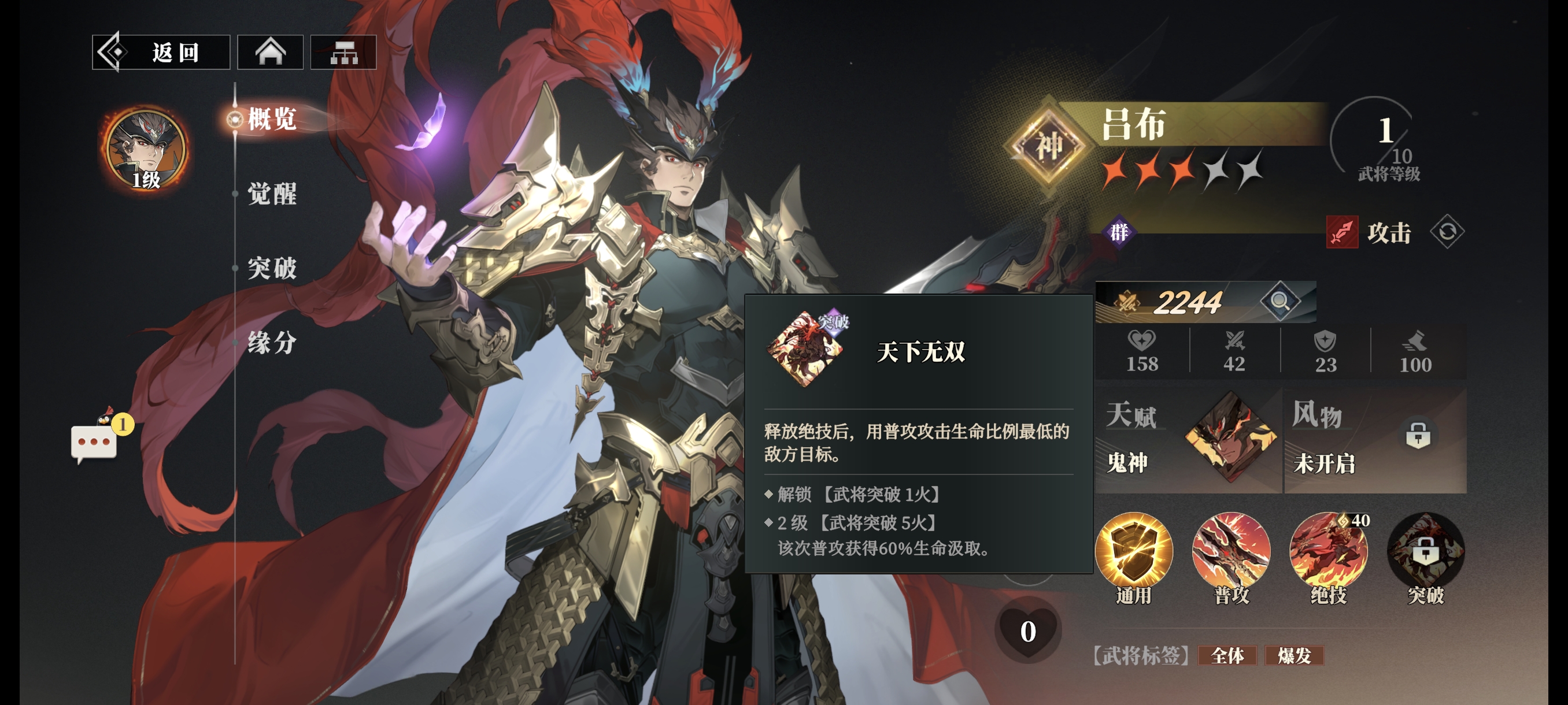 全游戏为数不多的范围型普攻,还有对单体时额外增伤补偿,武将1火时大招后追击1次普攻,使得吕布的普攻使用频率远高于其他C位。5火时追击普攻附加60%吸血,增加吕布的续航能力。