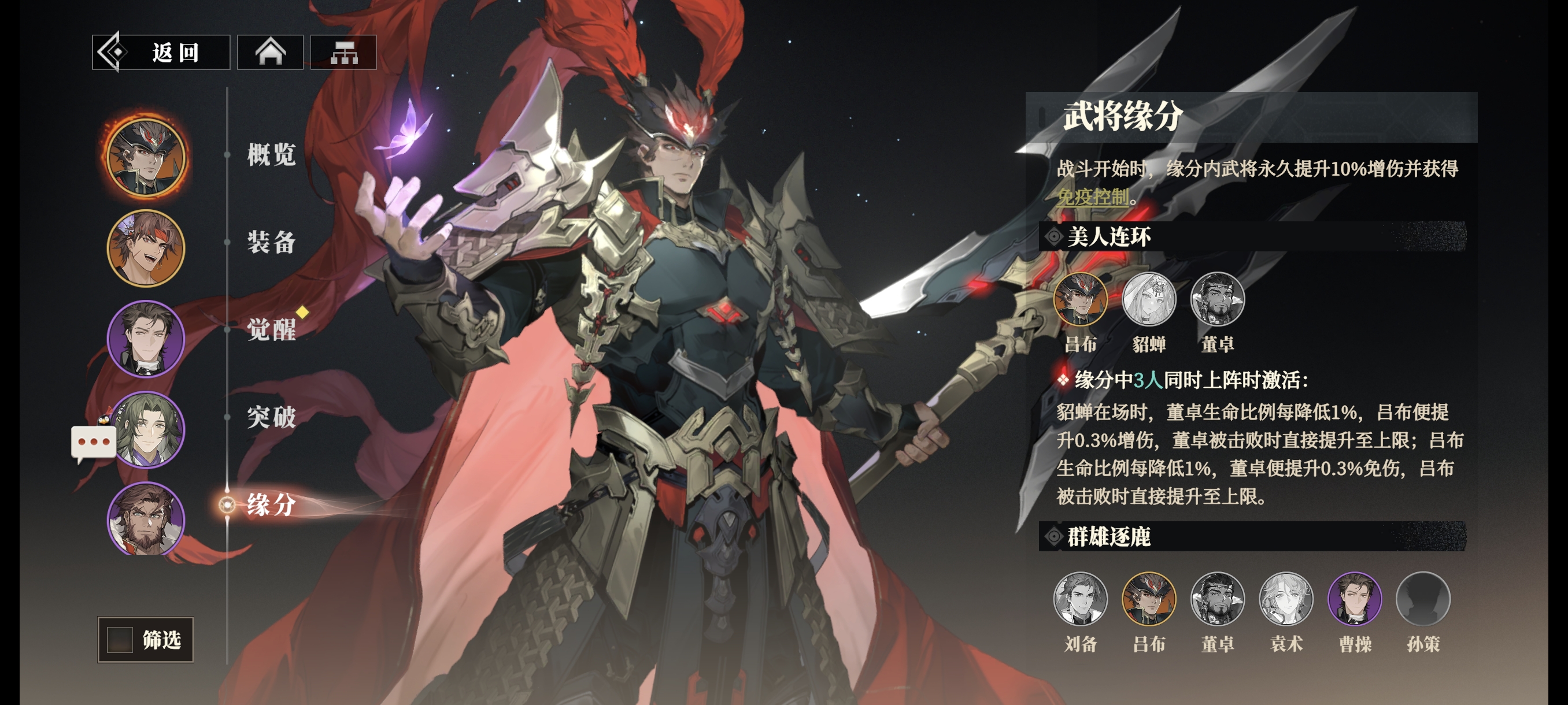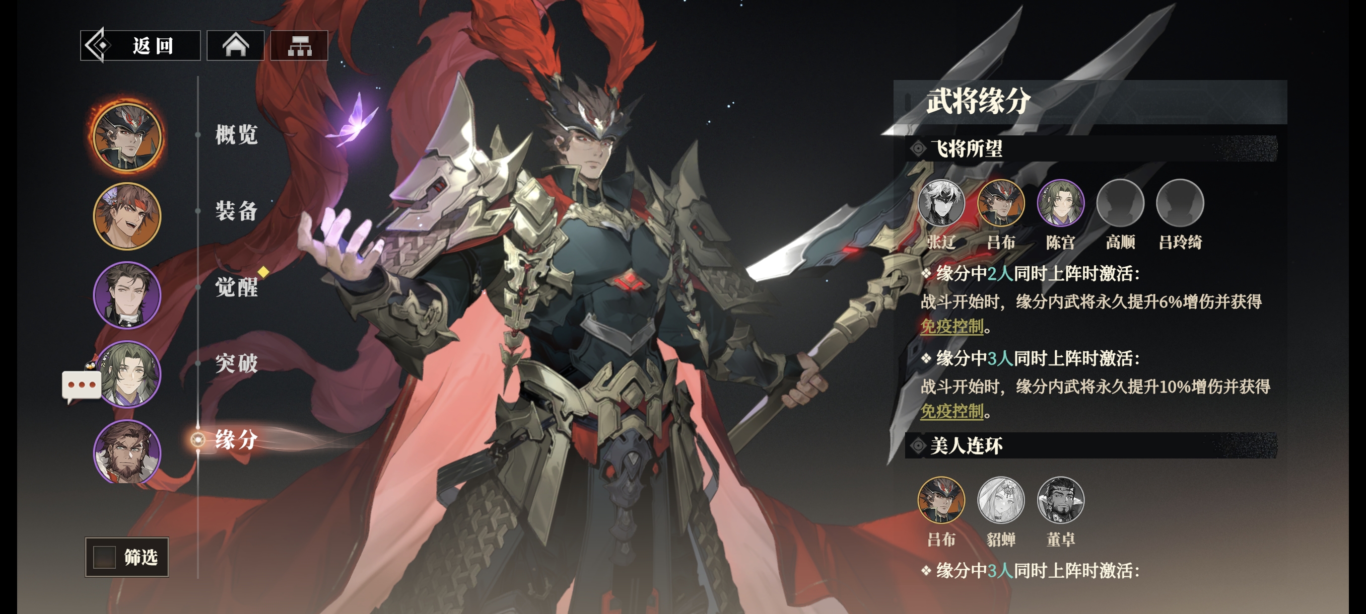 吕布的核心缘分!只要同时上阵缘分内2人即可激活。除少量增伤外,会使缘分内武将获得【免疫控制】,持续永久且不可驱散,让吕布的输出不会因被控所打断,输出稳定性拉满。