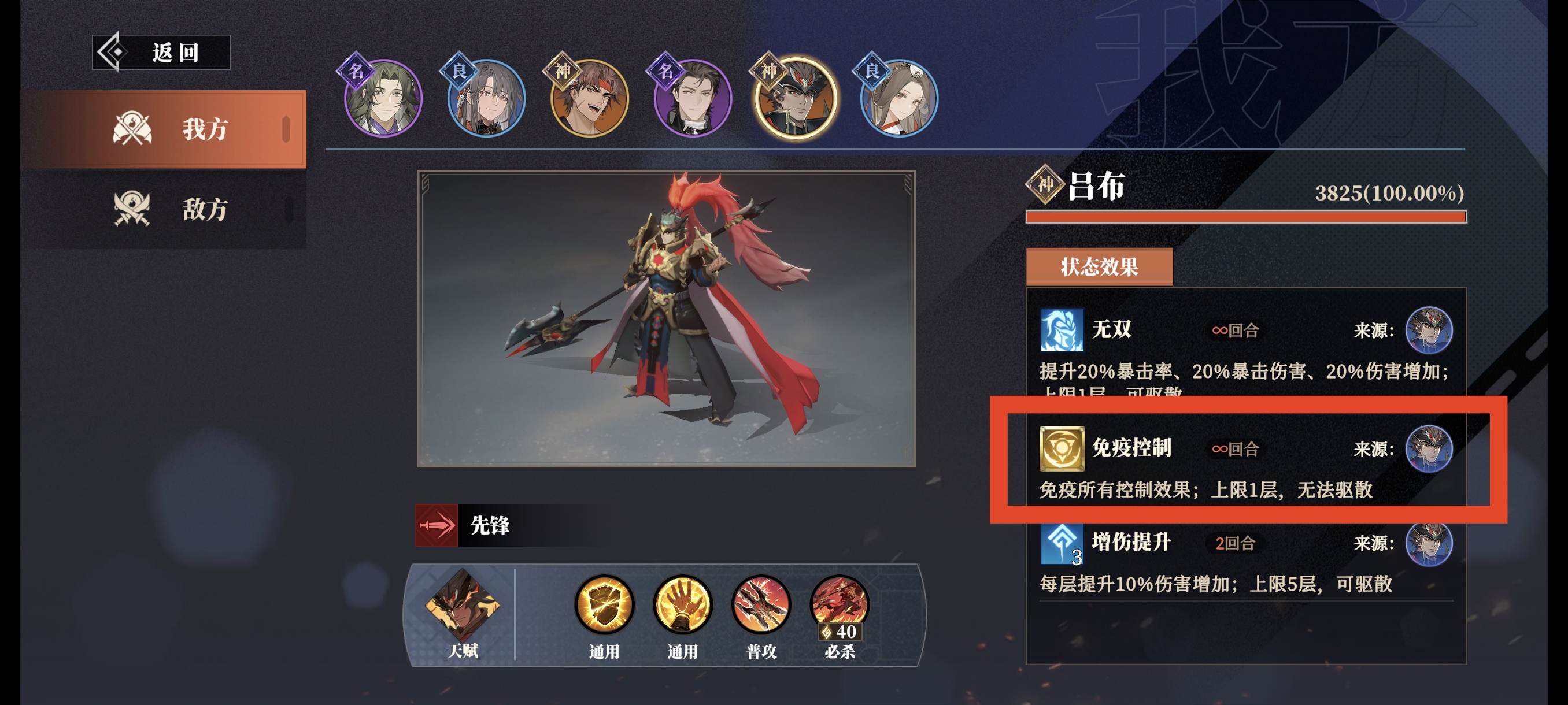 前期提升最大的是先锋,因为吕布是爆发型输出,基本前2回合已经决定胜负了,30%增伤是三个职业中最高的,但缺点是害怕驱散,被驱散加成就没了。