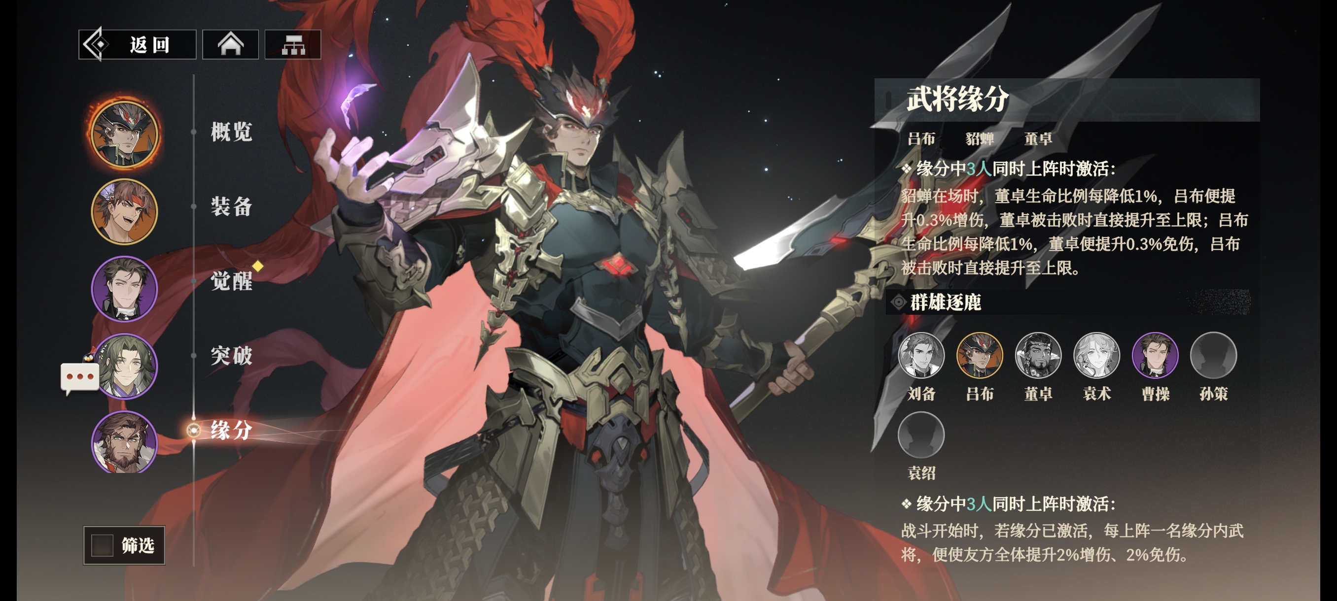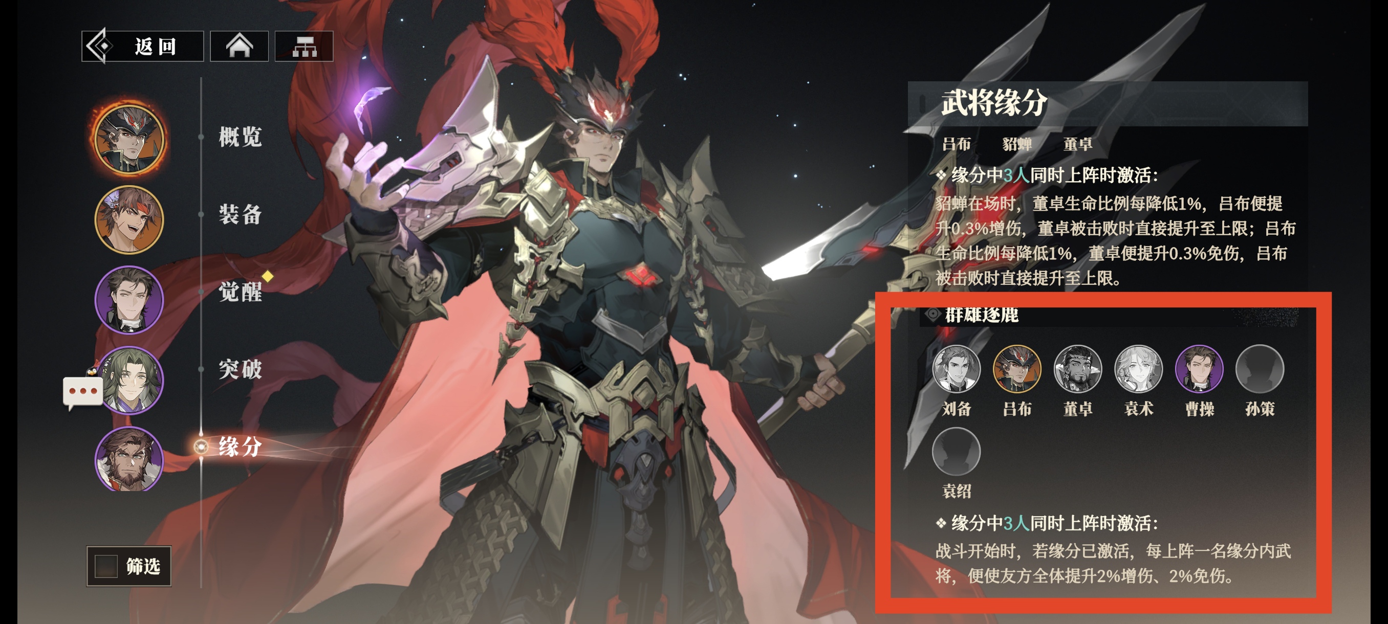 吕布董卓貂蝉激活缘分-美人连环,吕布陈宫激活缘分-飞将所望,吕布董卓袁术刘备激活缘分-群雄逐鹿。