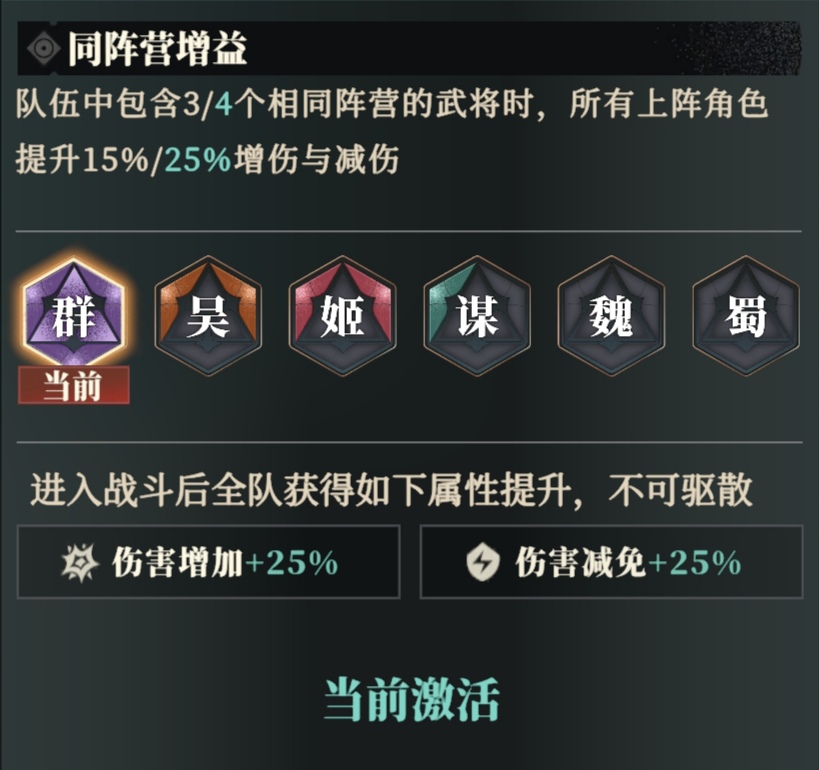 阵容中1肉盾+1输出+4辅助,虽然输出位只有吕布一人,但是将军和蹇硕都能让吕布获得额外出手次数。6人中有4名群雄武将,可以激活满额25%增减伤的阵营加成。