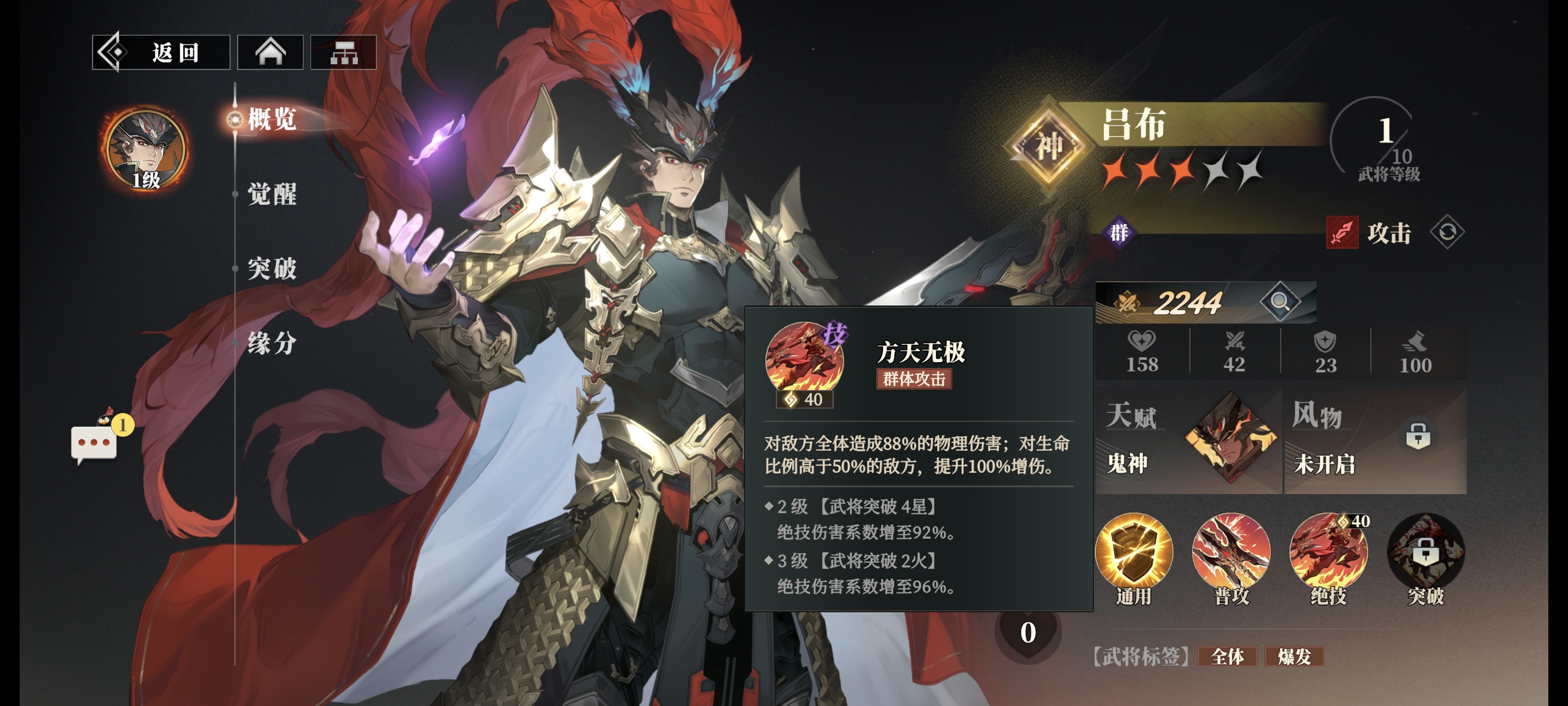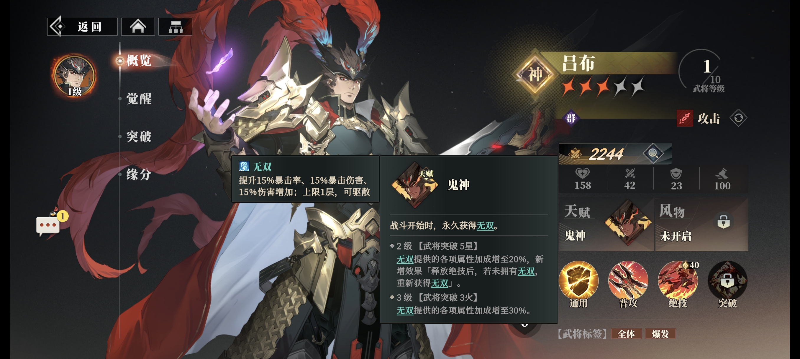 开场吕布永久获得【无双】,天赋升到2级每次大招后若没有【无双】会重新获得。