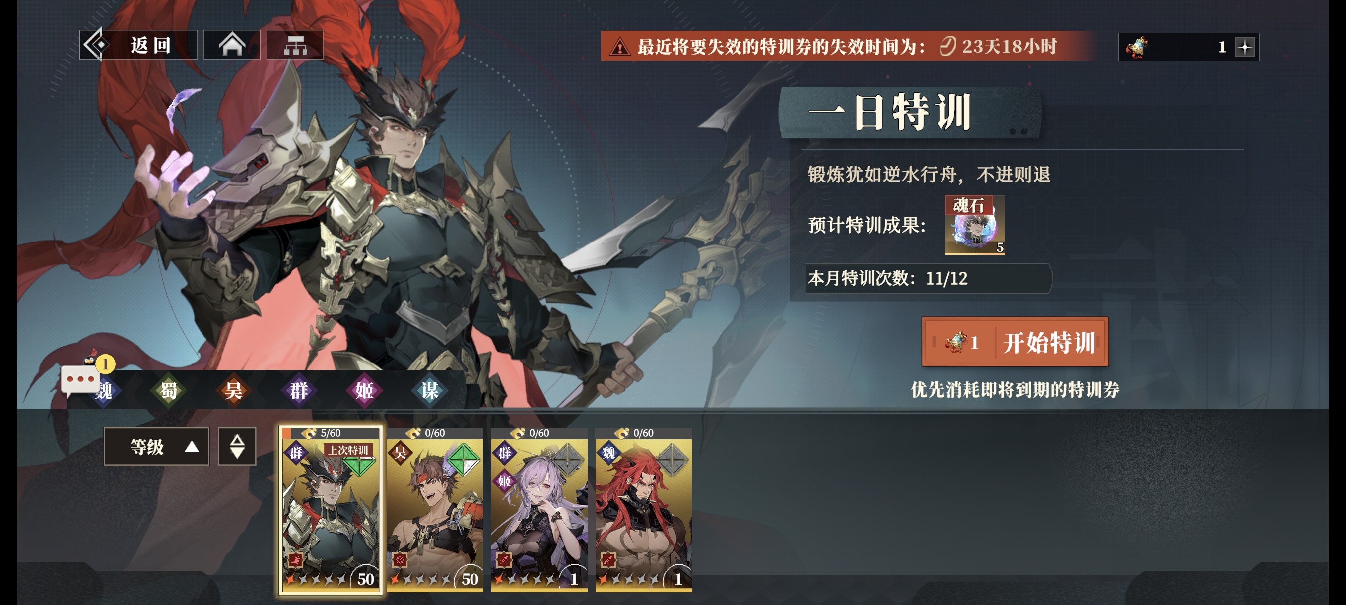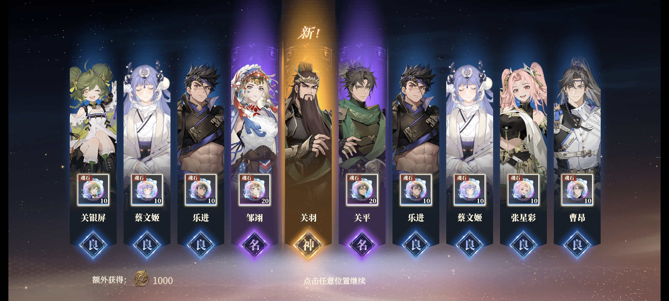 通关第11章后,将之前攒的抽(家园拼图集齐后有抽卡券奖励)凑够今天的第5-7次十连抽。将能升星的武将全部升星开图鉴。