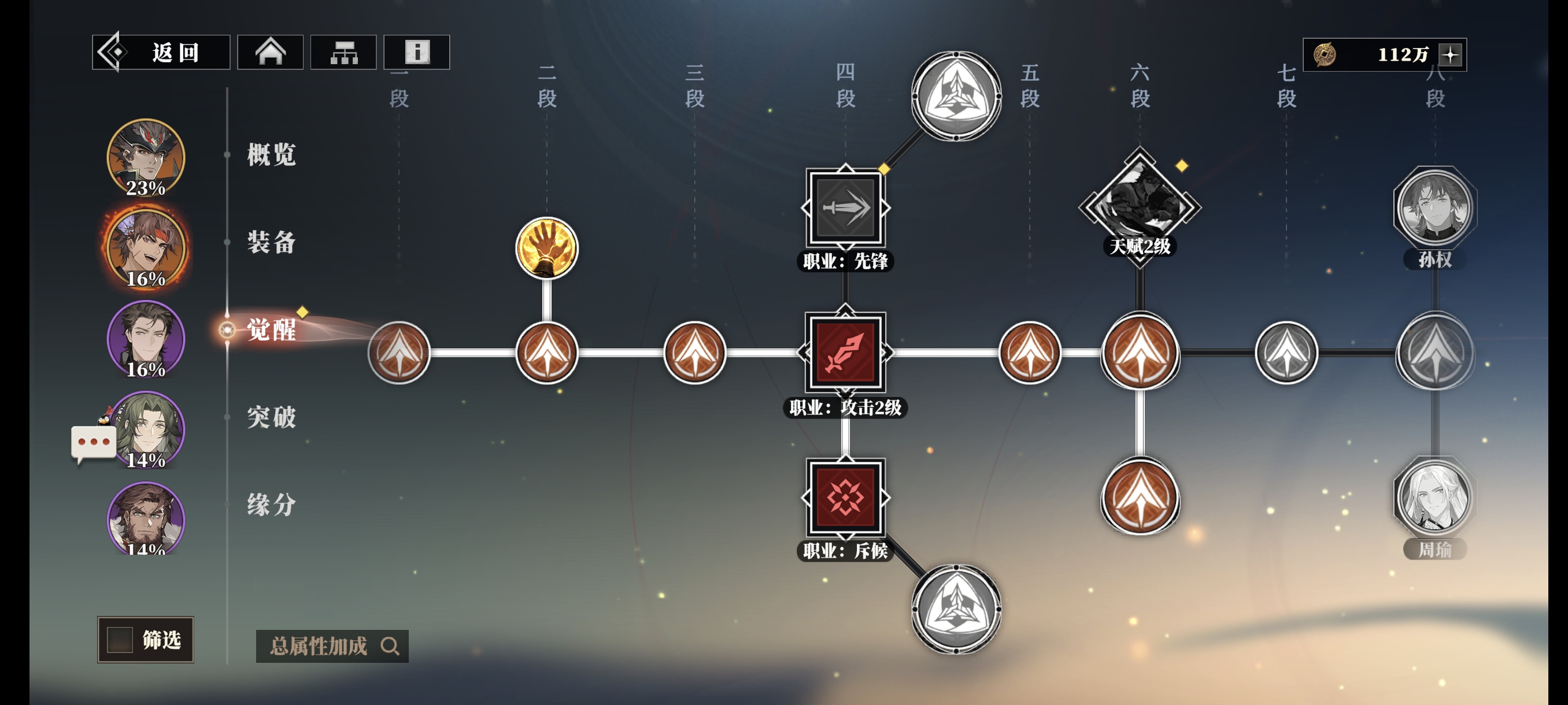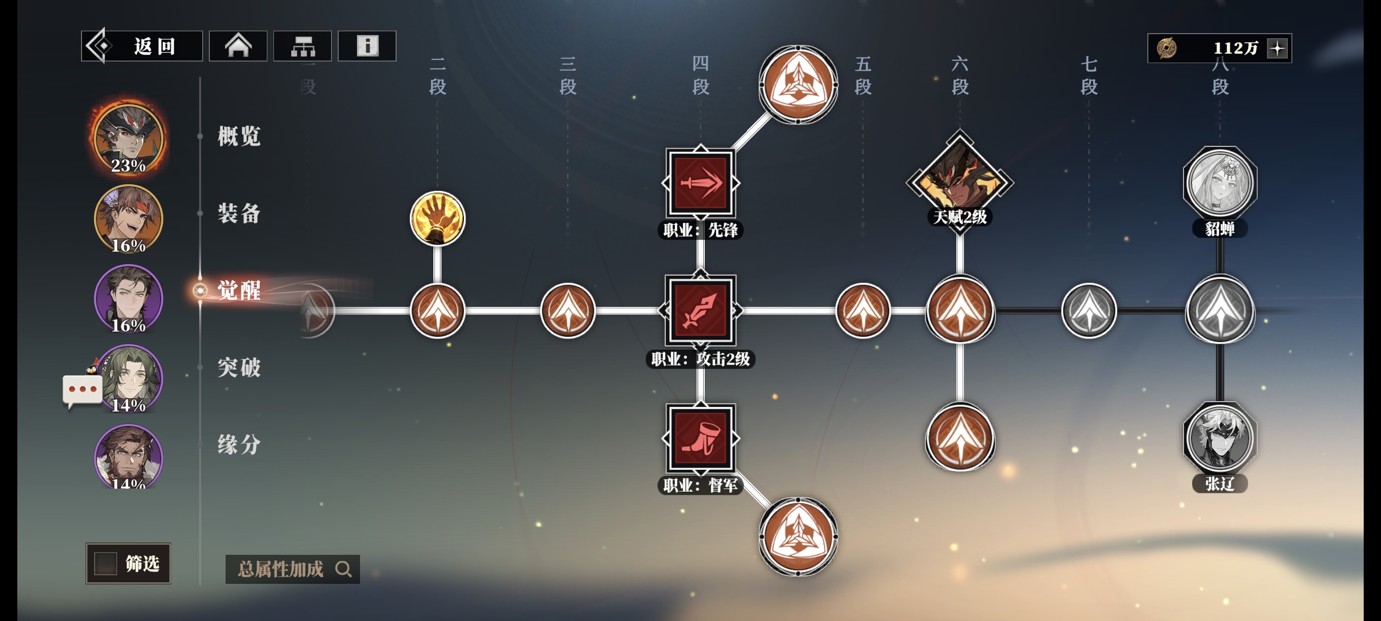 将所有上阵武将的觉醒点到6段,过渡武将只点主线不用全部点满,主C全部拉满。