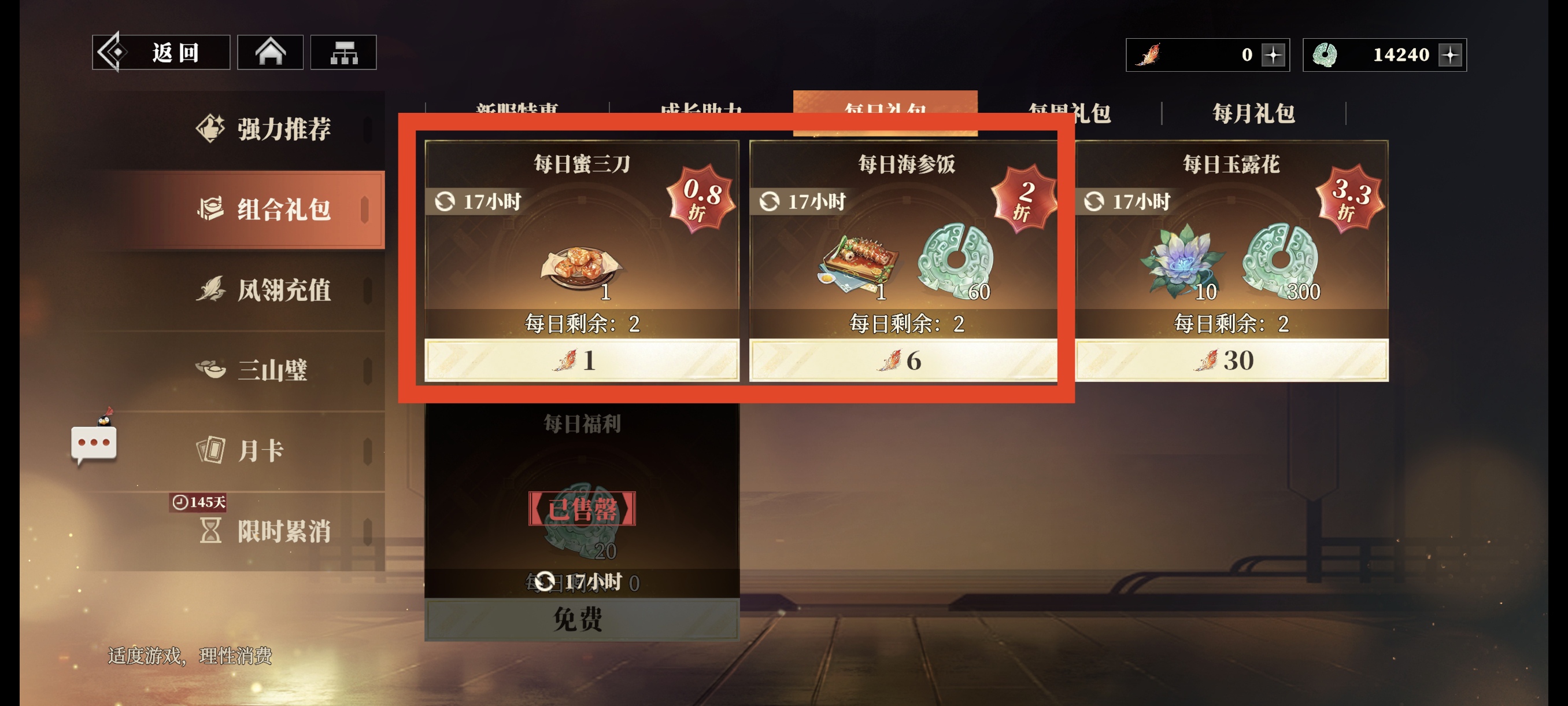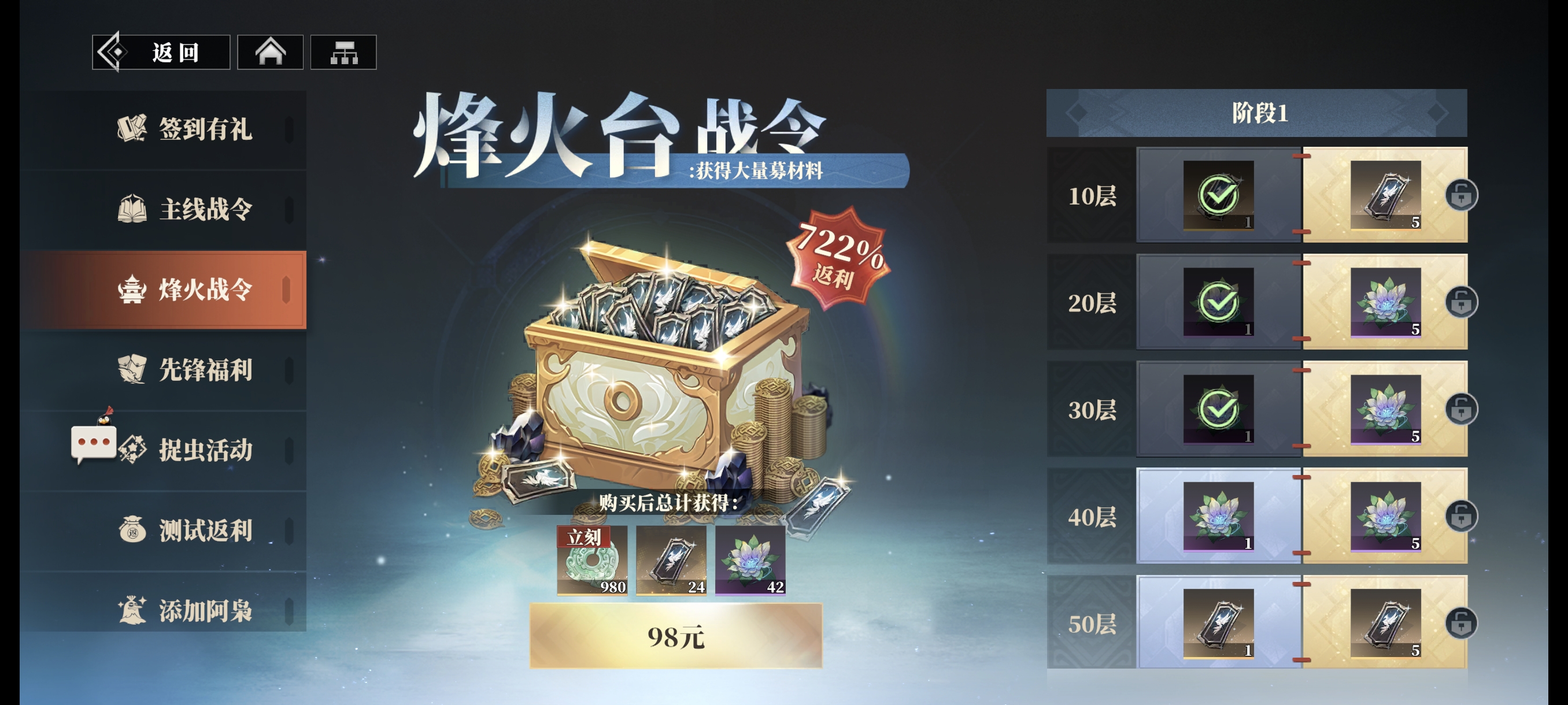 5、今日氪度,烽火战令98+体力2=100块,总计累充134+100=234块