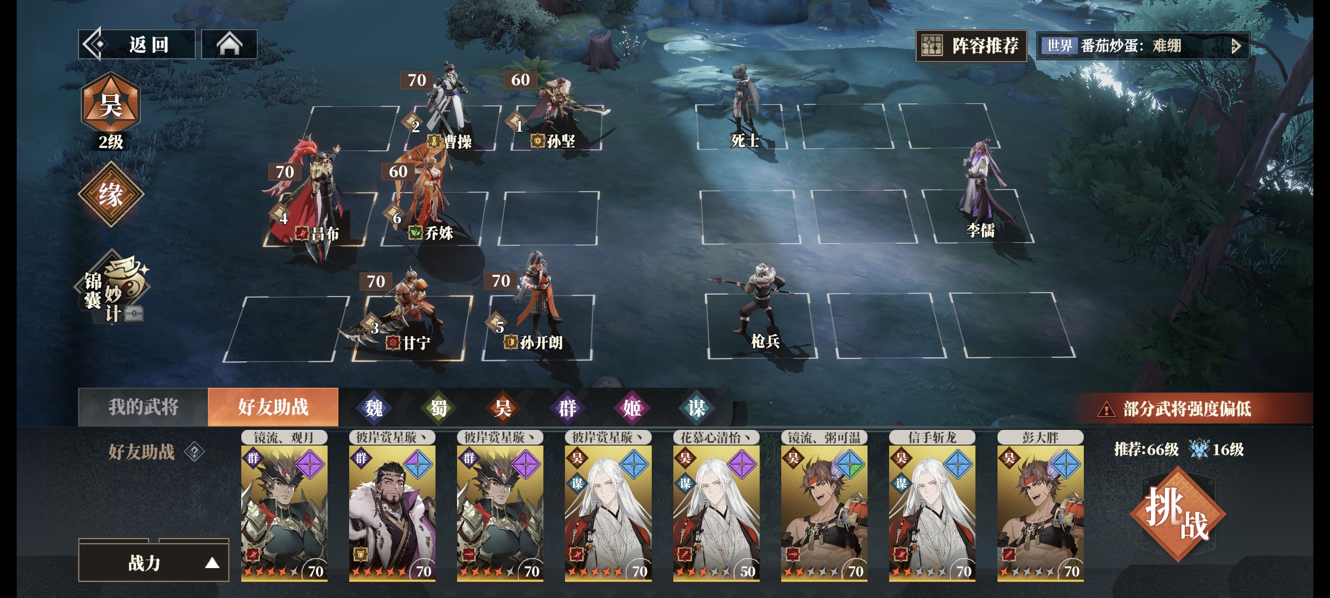 自己的武将练度不够的话,最简单的打法就是直接借大佬的助战!高星吕布大招后自带普攻,对单伤害极高,直接借个高星吕布此战难度降低大半。