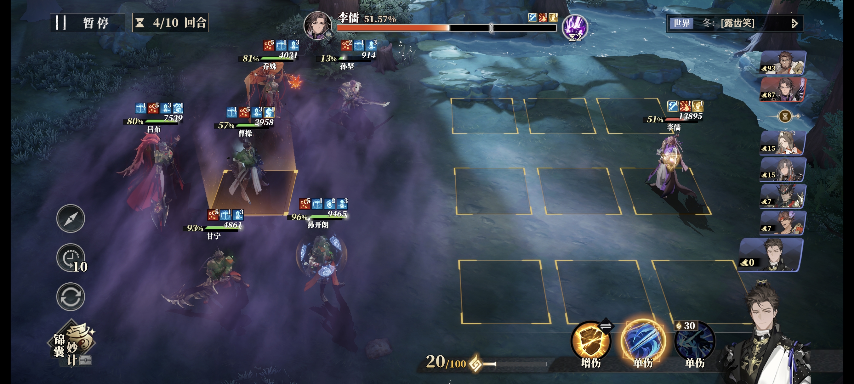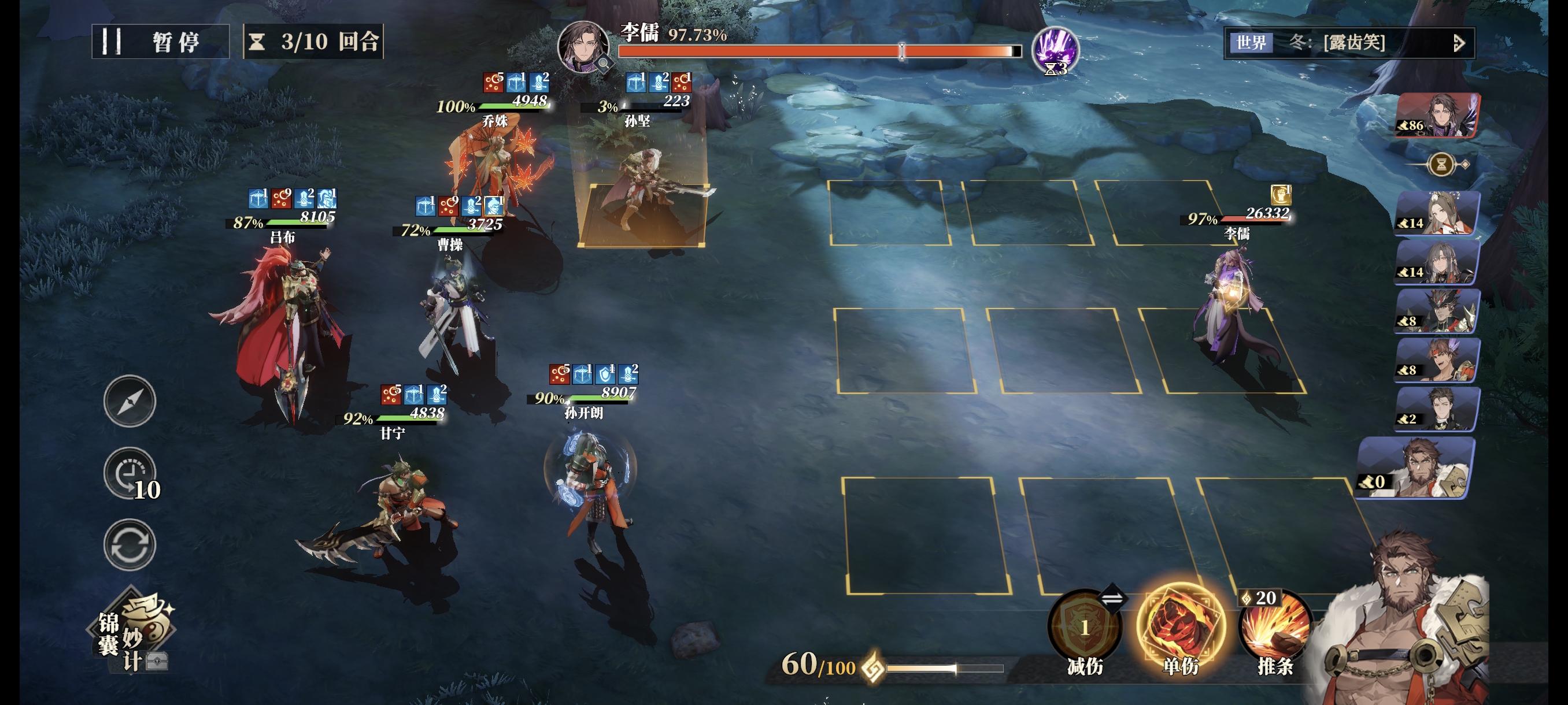 第二次再做满星通关,主要难点就是7回合以内胜利。在不用为辅助武将留怒气放大招后,输出英雄可用的怒气增加不少,甘宁曹操每回合都开大招,输出充足。