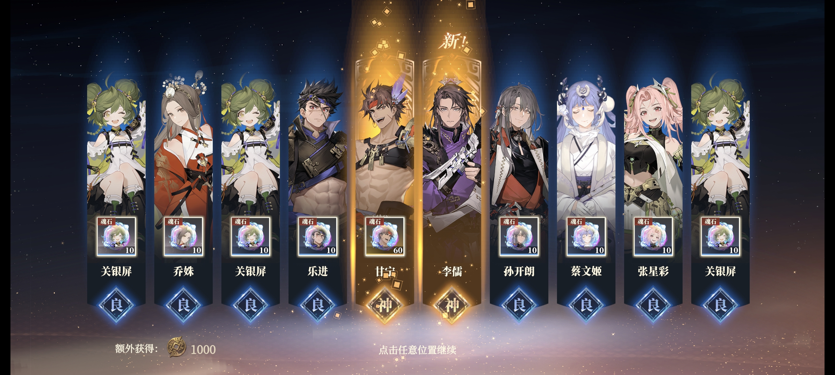 通关第九章后,将攒下的抽卡券抽取今天的第3-4次十连抽,震惊竟然出了双黄,不确定是不是设定必出的。