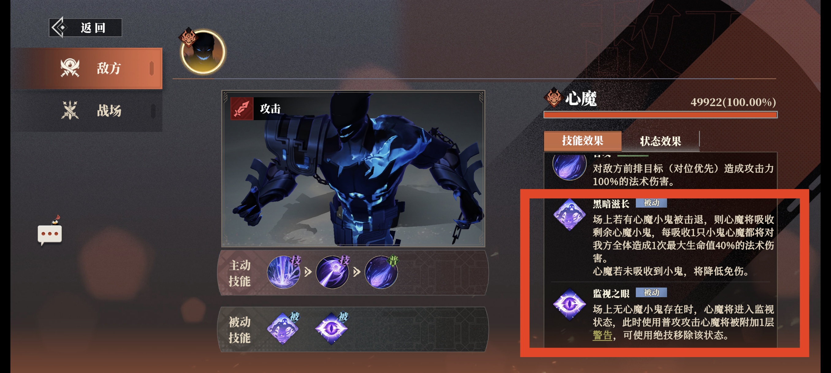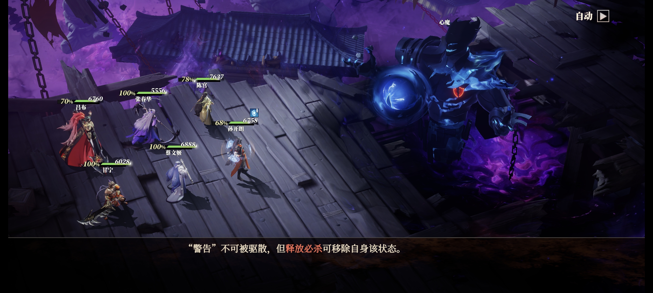 杀完小鬼后,BOSS不能被连续普攻2次(成就需要),当普攻一次后就尽量在第二次行动时放大招解除【警戒】,通用技能尽量留住应急,万一第二次怒气不够放大招时,再用来过渡,不会触发【警戒】。