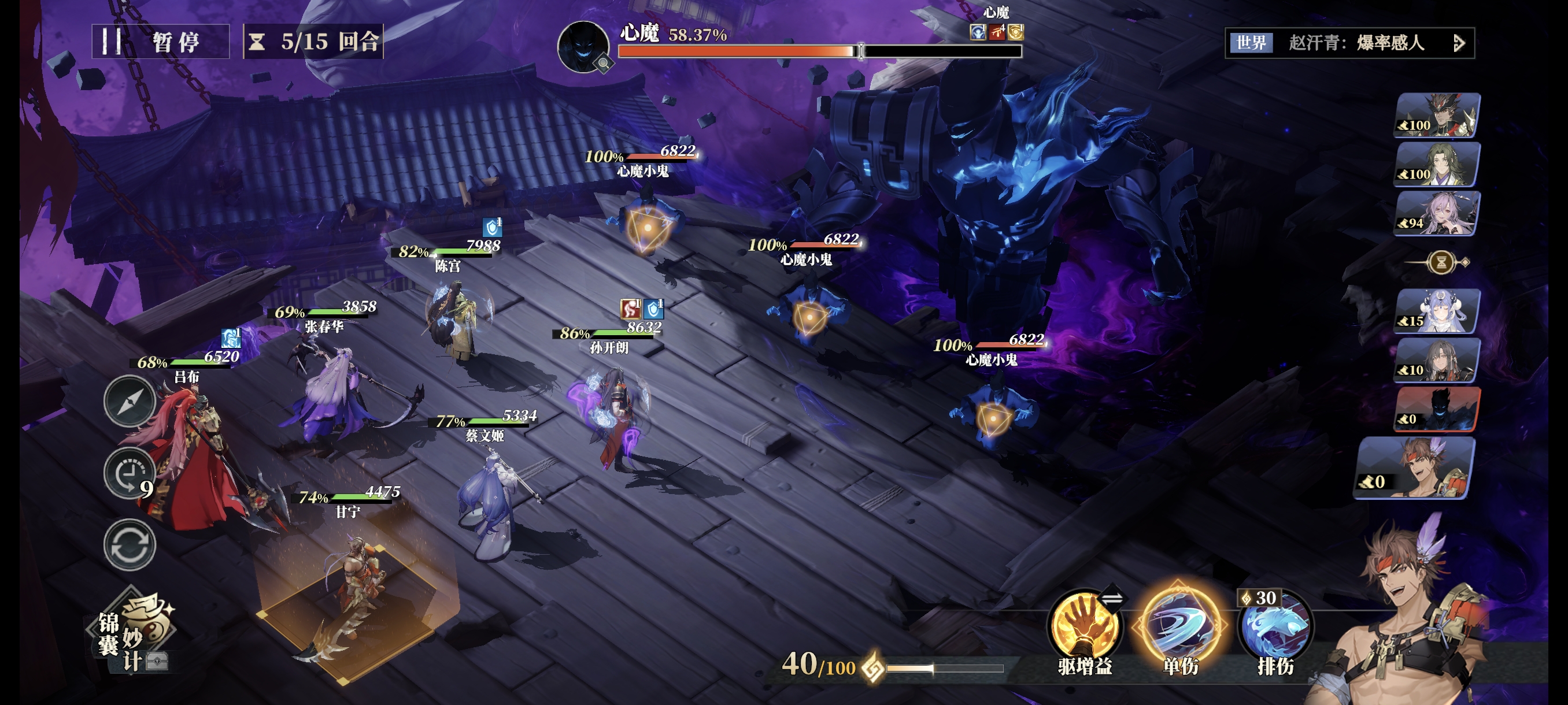 老规矩直接借大佬的吕布,因为小鬼需尽量同时杀死,才能不触发BOSS群攻。吕布和甘宁双保险,保证小鬼能同时死,减少治疗压力。
