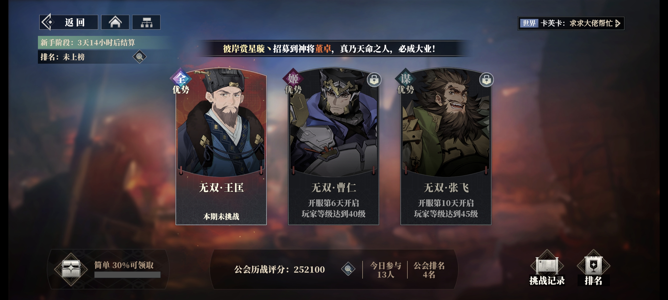 公会厉战中,挑战本期BOSS-王匡,多上阵群攻武将,尽快清理杂兵,再攻击BOSS本体。