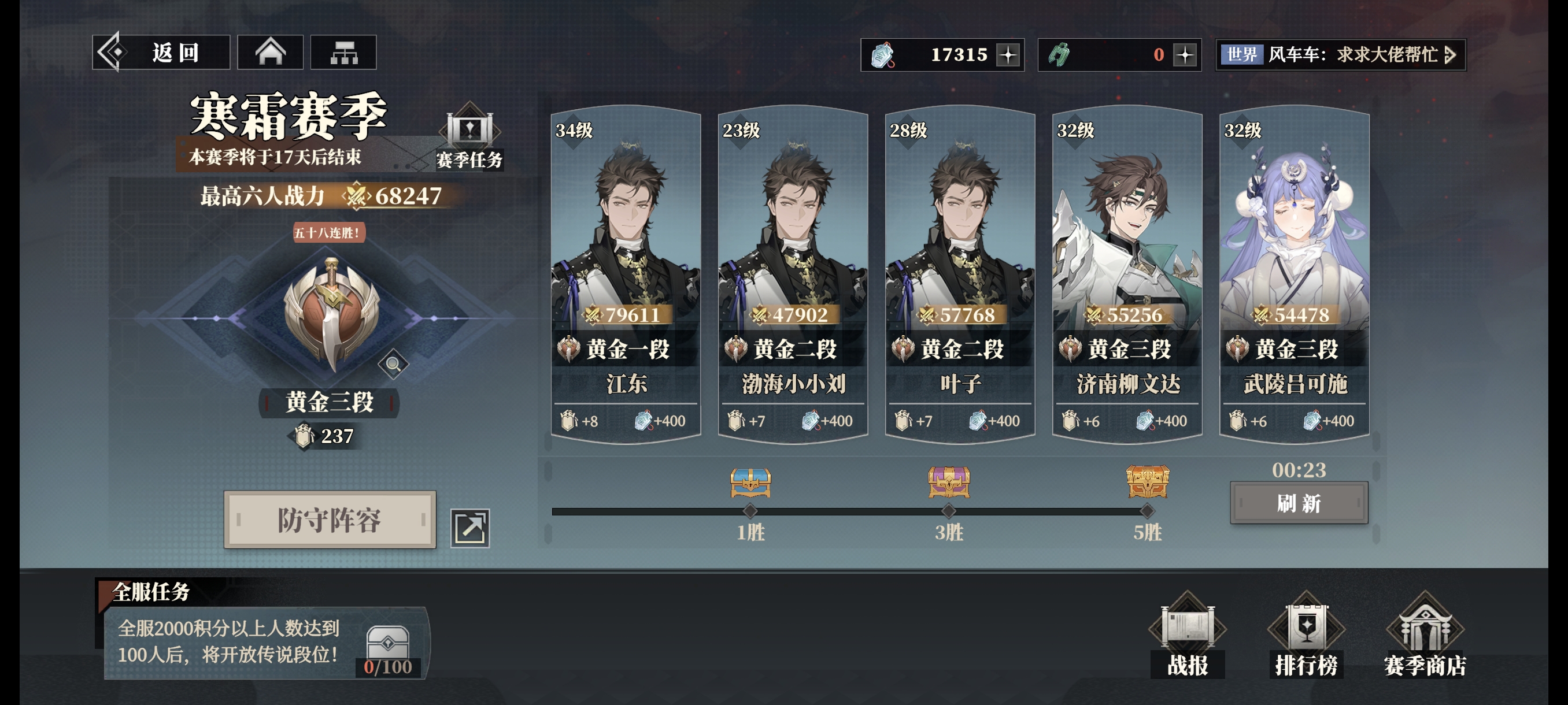 最后把竞技场阵容更新一下,换上群雄四人组+甘宁孙开朗,激活4群雄光环。竞技场打到拿不满五连胜奖励就停。