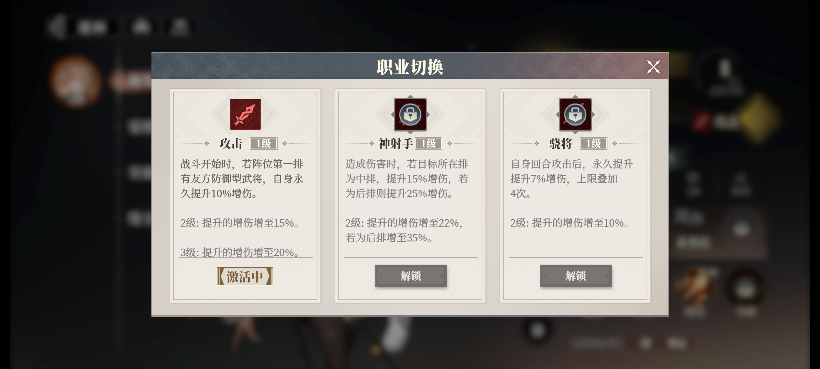 职业有等级划分,随觉醒养成段数提升。初始职业最高可升至3级,其他职业最高2级。前期提升最大的是神射手,无需叠加开场对中排就有15%增伤,对后排25%增伤,可以在首回合的大招中就打出高额伤害。虽然对前排无增伤效果,但一般也没人会把脆皮放前排。