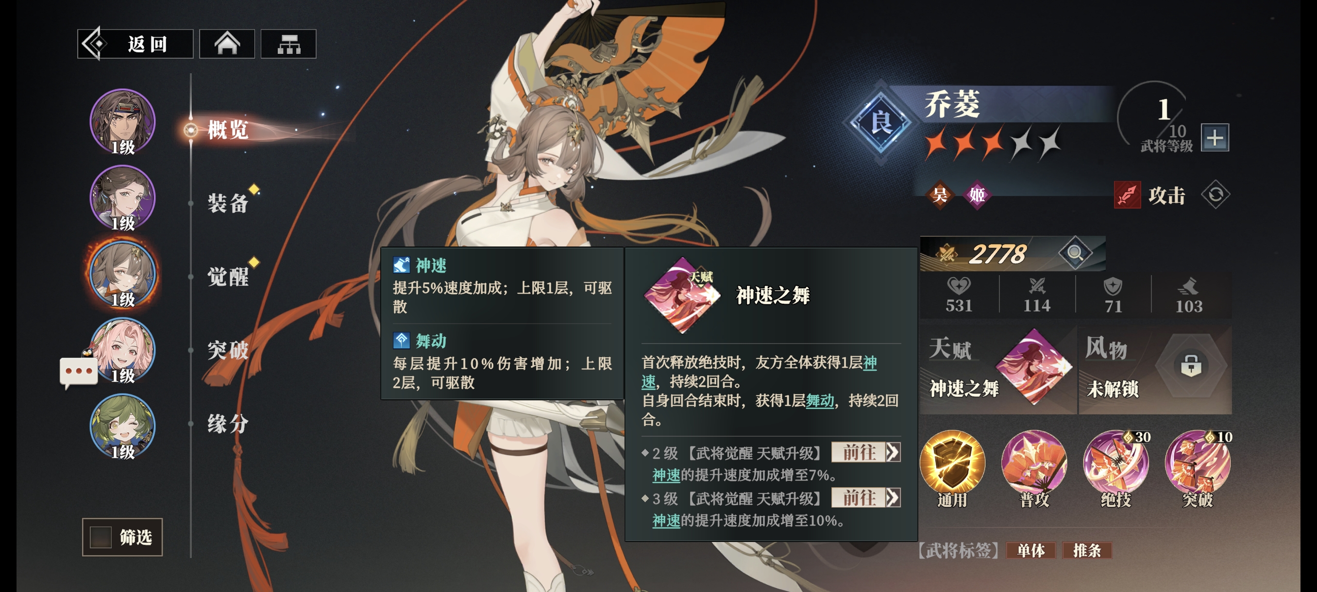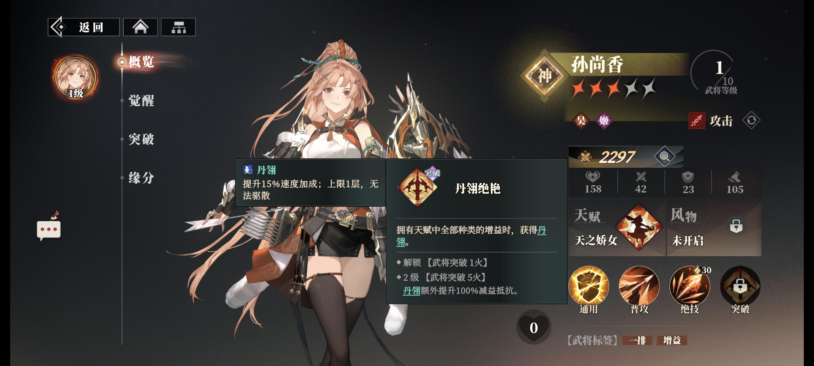 孙尚香105点的基础速度,已经是全武将初始最高速了,第二回合获得【丹翎】后速度突破120点,冠绝所有武将。