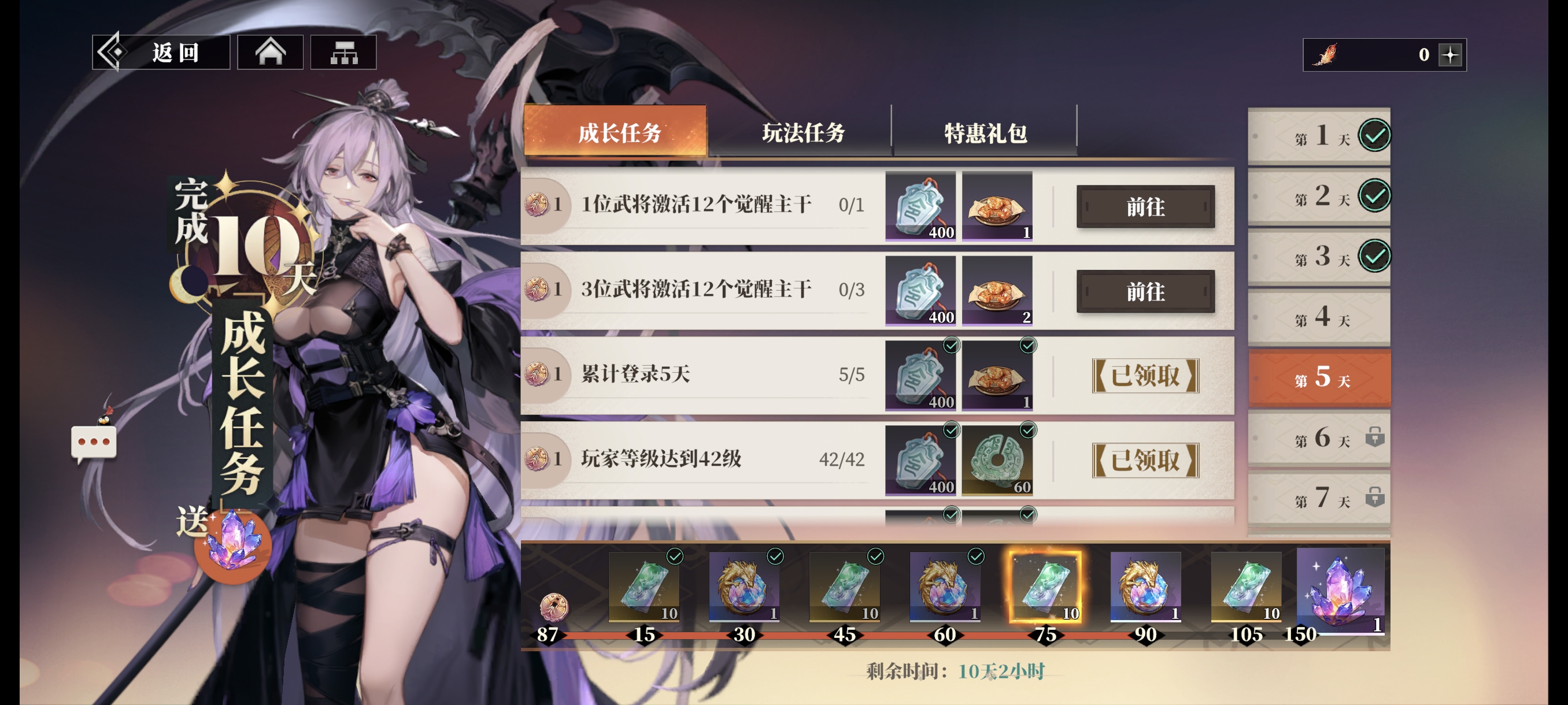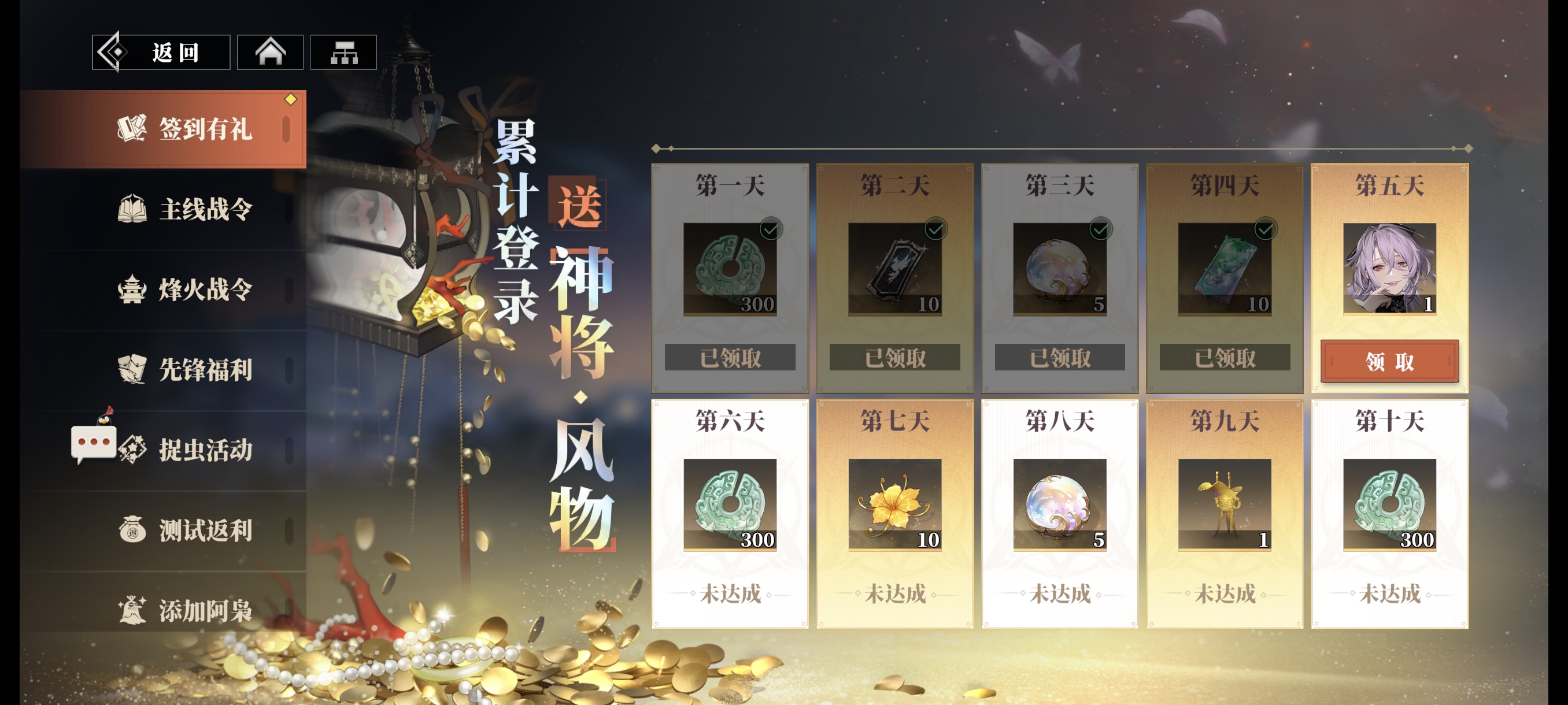 第五天上线先领取所有签到奖励,然后把三山里的日常全部做掉,钓鱼和拼图能拿不少三山壁和抽卡券,今天送了张春华和十连心愿抽。
