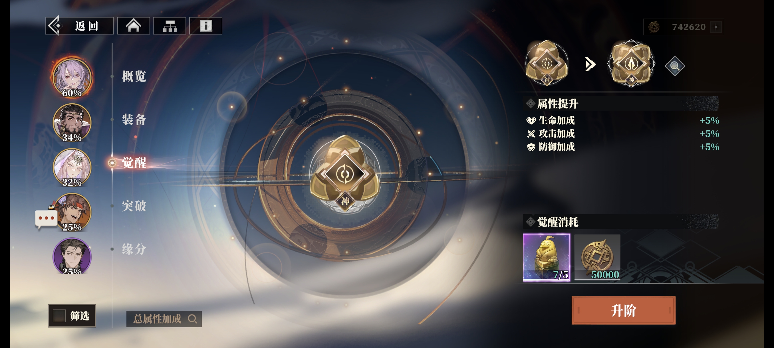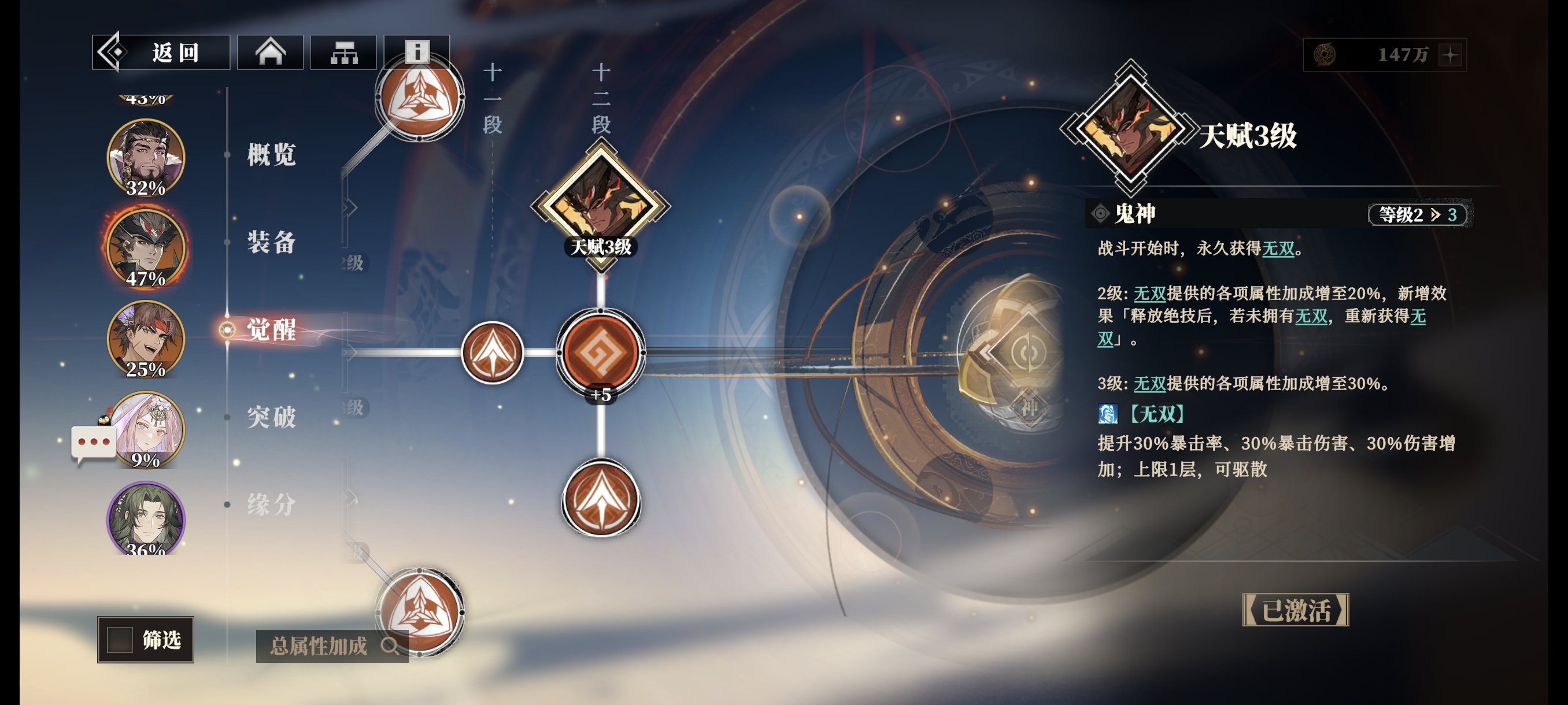 一口气将主副C吕布和春华的觉醒全部拉满,再把董卓和貂蝉的等级和觉醒也补到全队平均水平。