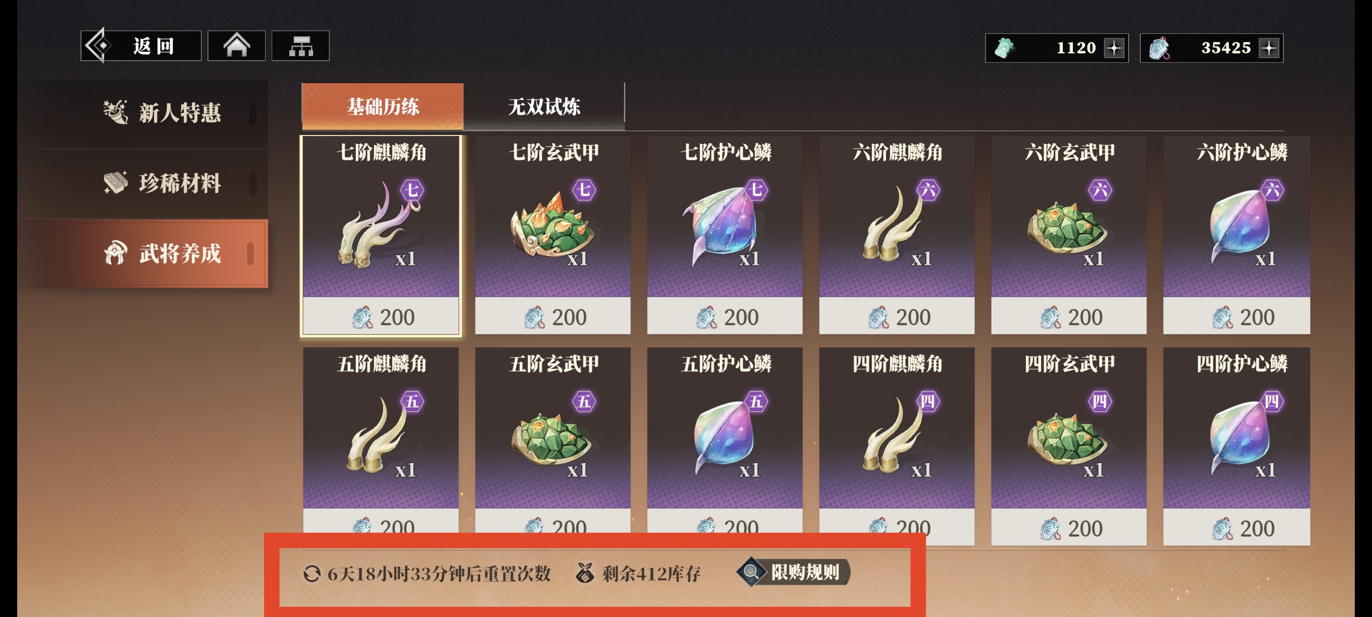 商店的武将养成材料是每周刷新的,再加上烽火战令送了很多【玉露花】可以不要体力刷武将材料。