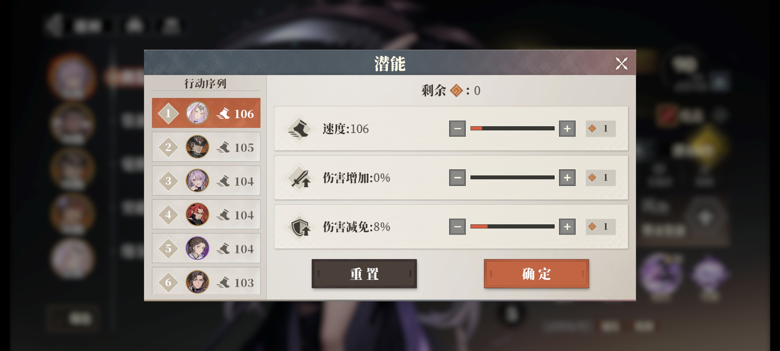 因为主C吕布的速度点满5点潜能后是105,所以就讲能给吕布加增伤的辅助貂蝉速度调至106,在吕布出手前附加【红绡】和【护盾增伤】。