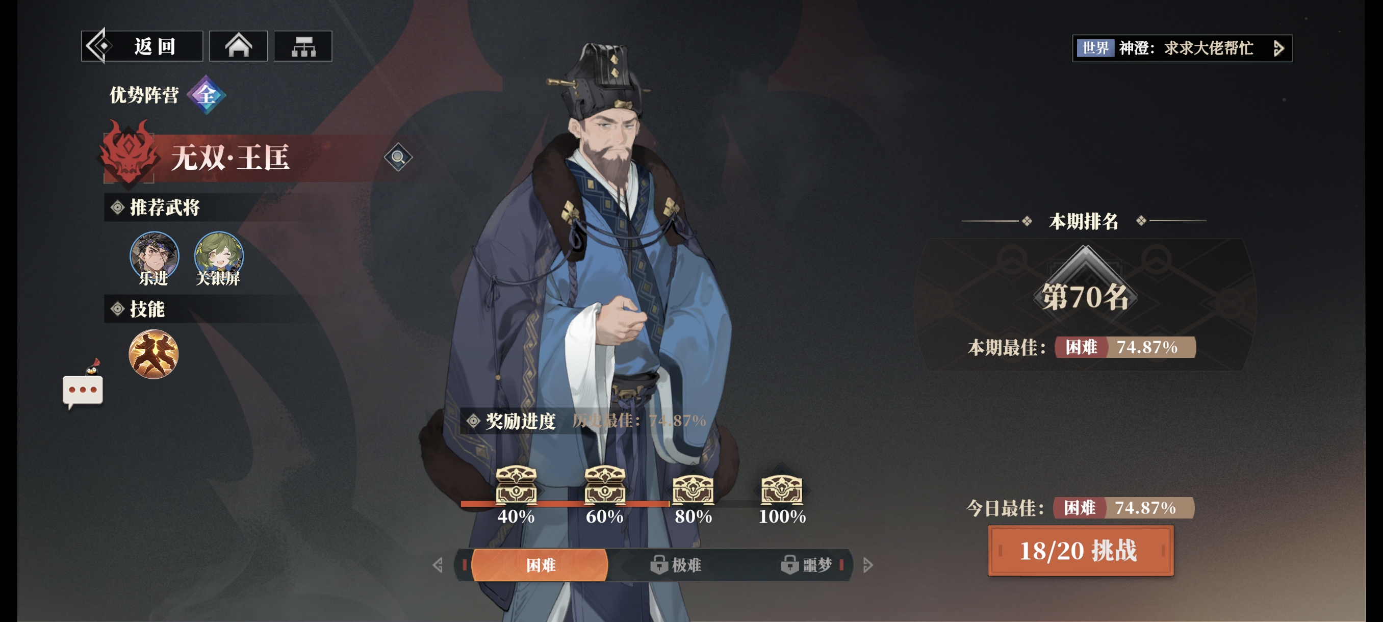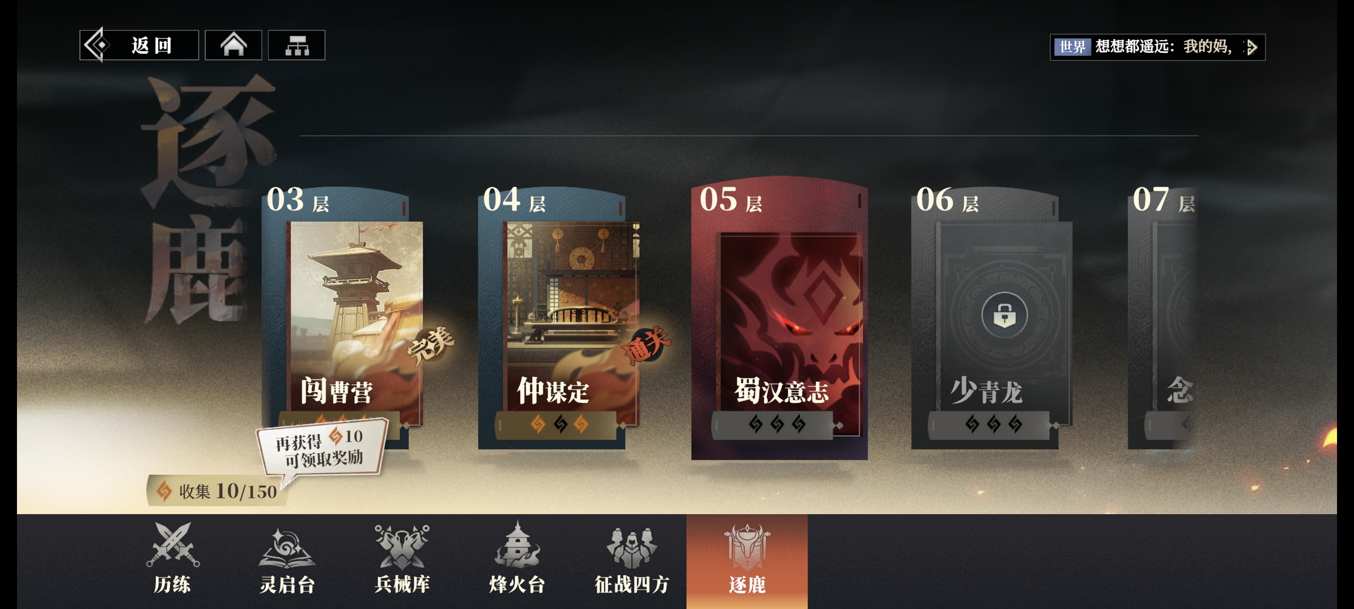 接下来是逐鹿副本,此副本是6V6的常规战斗,通关星级达标后可获得扶桑叶(风物抽)和灵犀玉(每天武将特训材料),都是比较重要的养成资源,尽量推到能打的最高。
