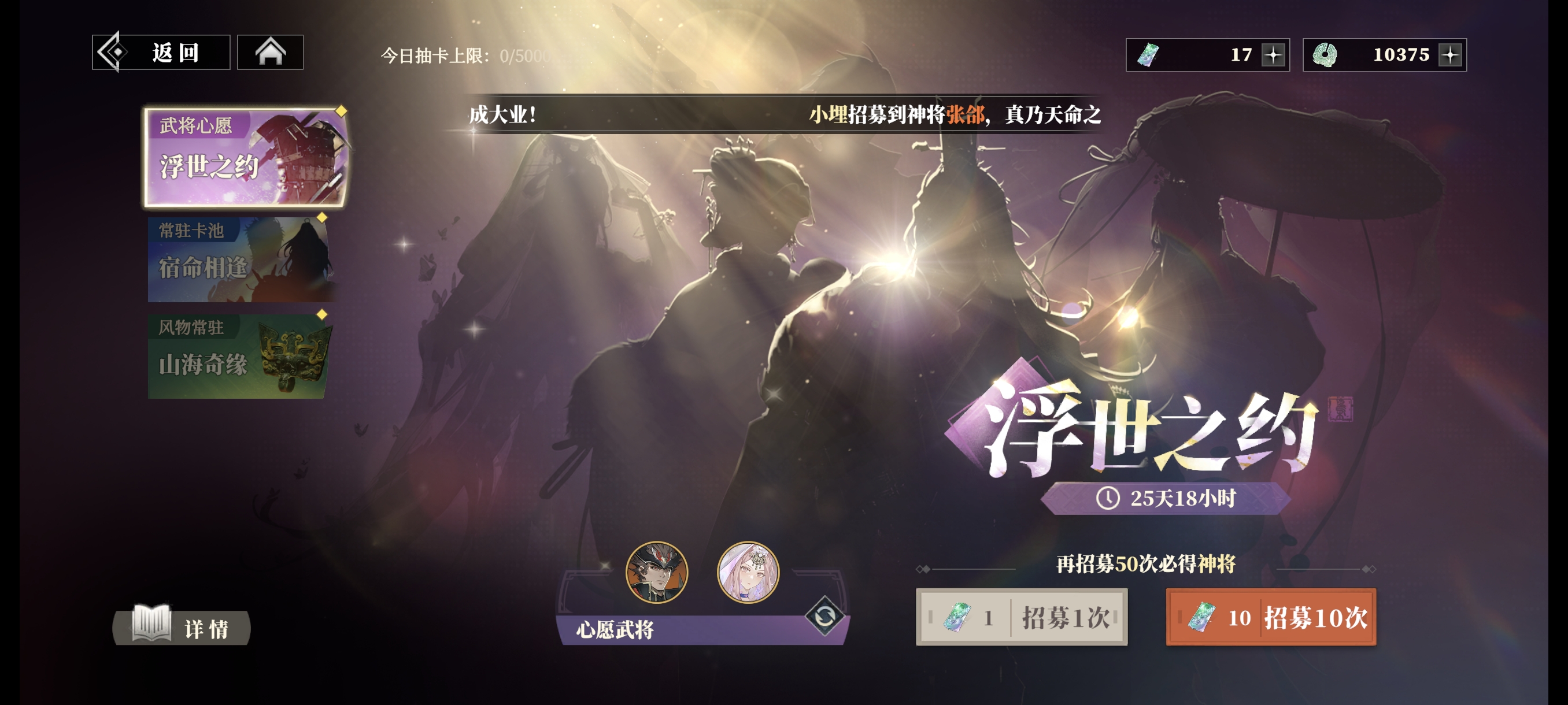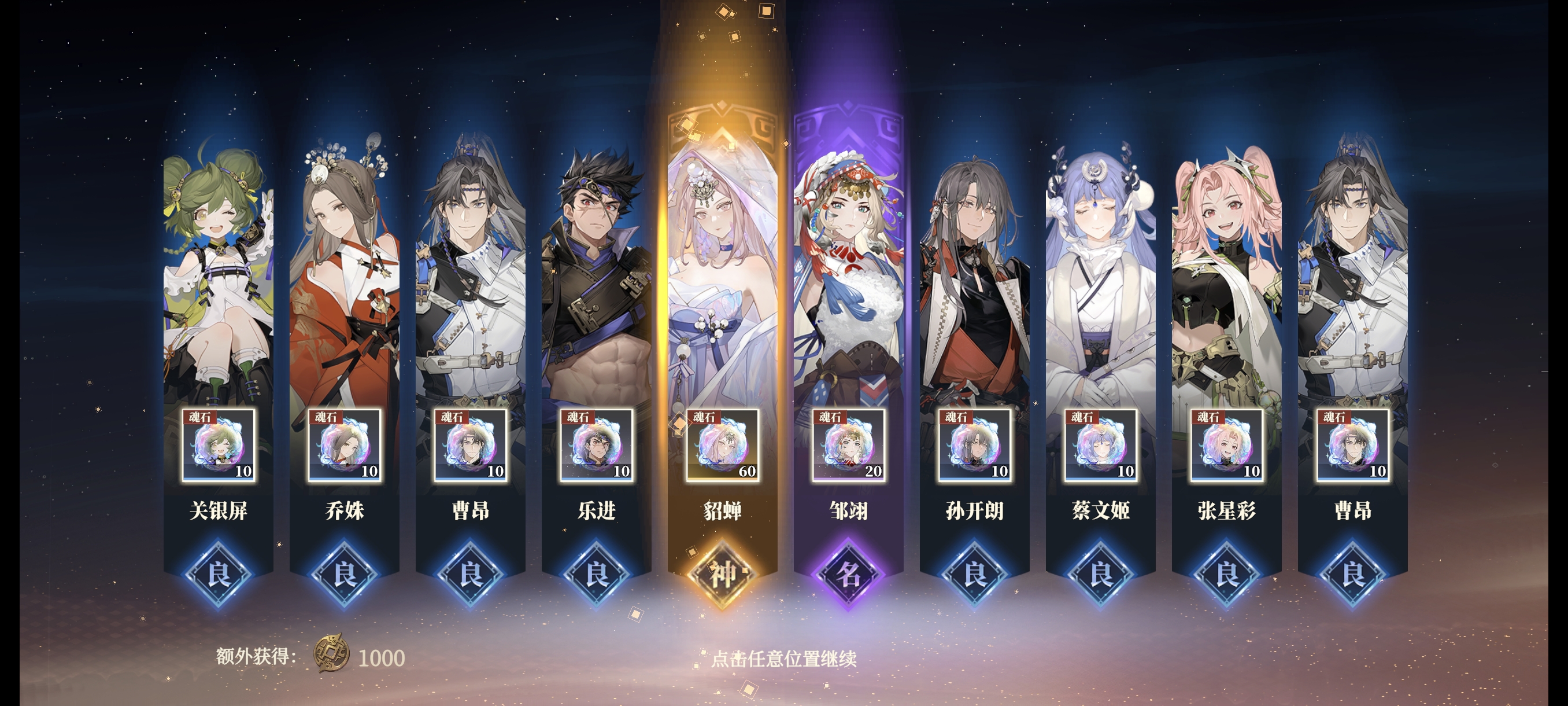 用昨天剩下的抽+签到日常给的凑够今天的第1-2次十连抽,用三山壁补齐30心愿抽提前出了心愿貂蝉,运气不错。