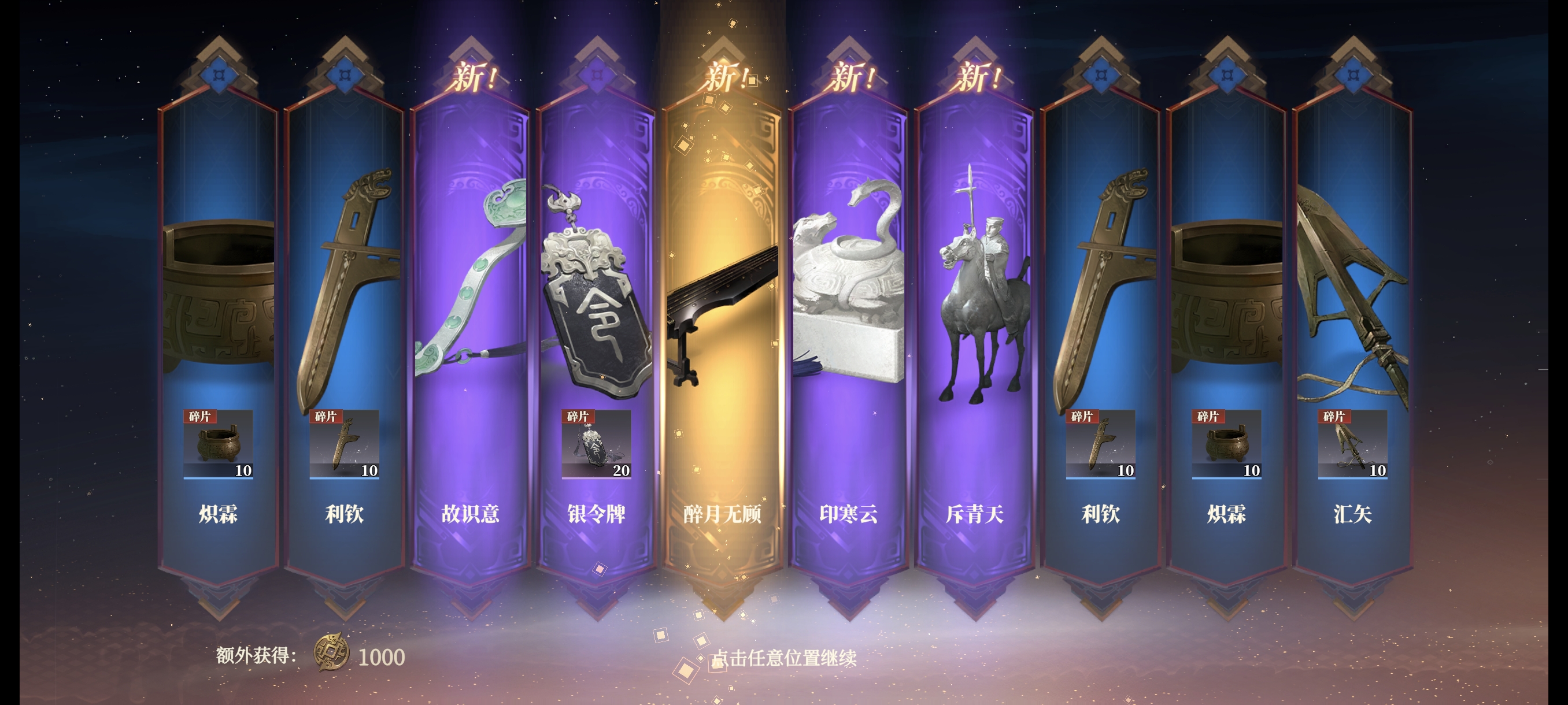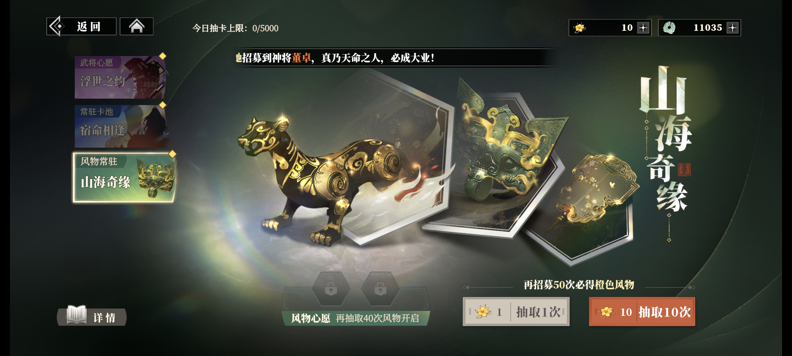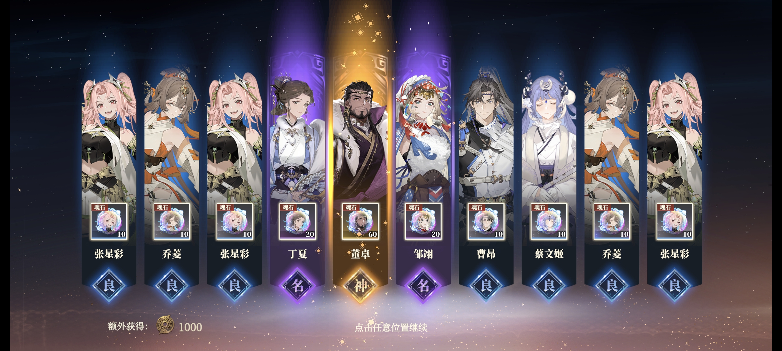 用主线和各种活动攒的抽凑齐今天的第3-5次十连抽和10风物抽,保底拿到一个董卓和第一个橙色风物。
