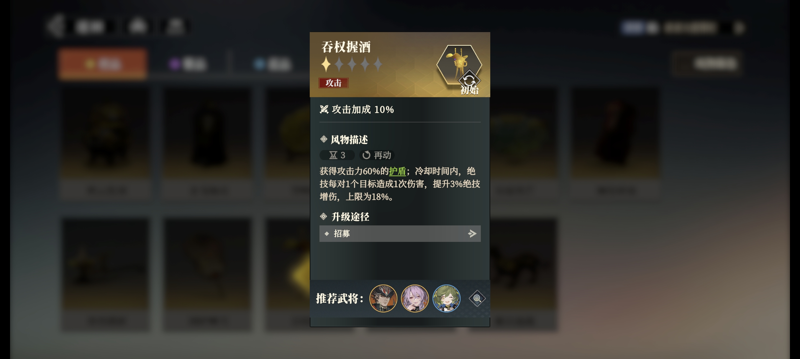 群雄爆发阵容心愿风物推荐选择:吞权握酒和岳峙回云。