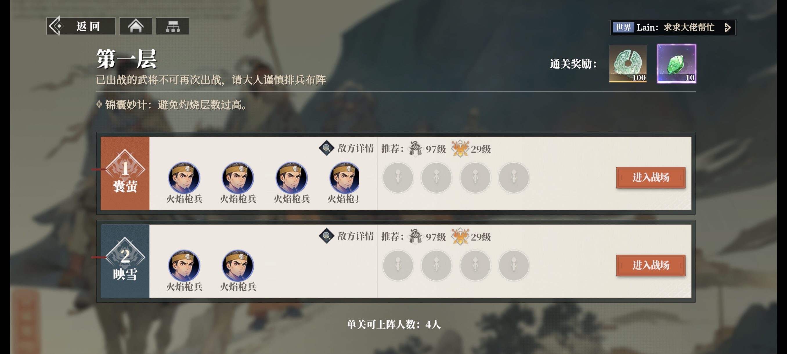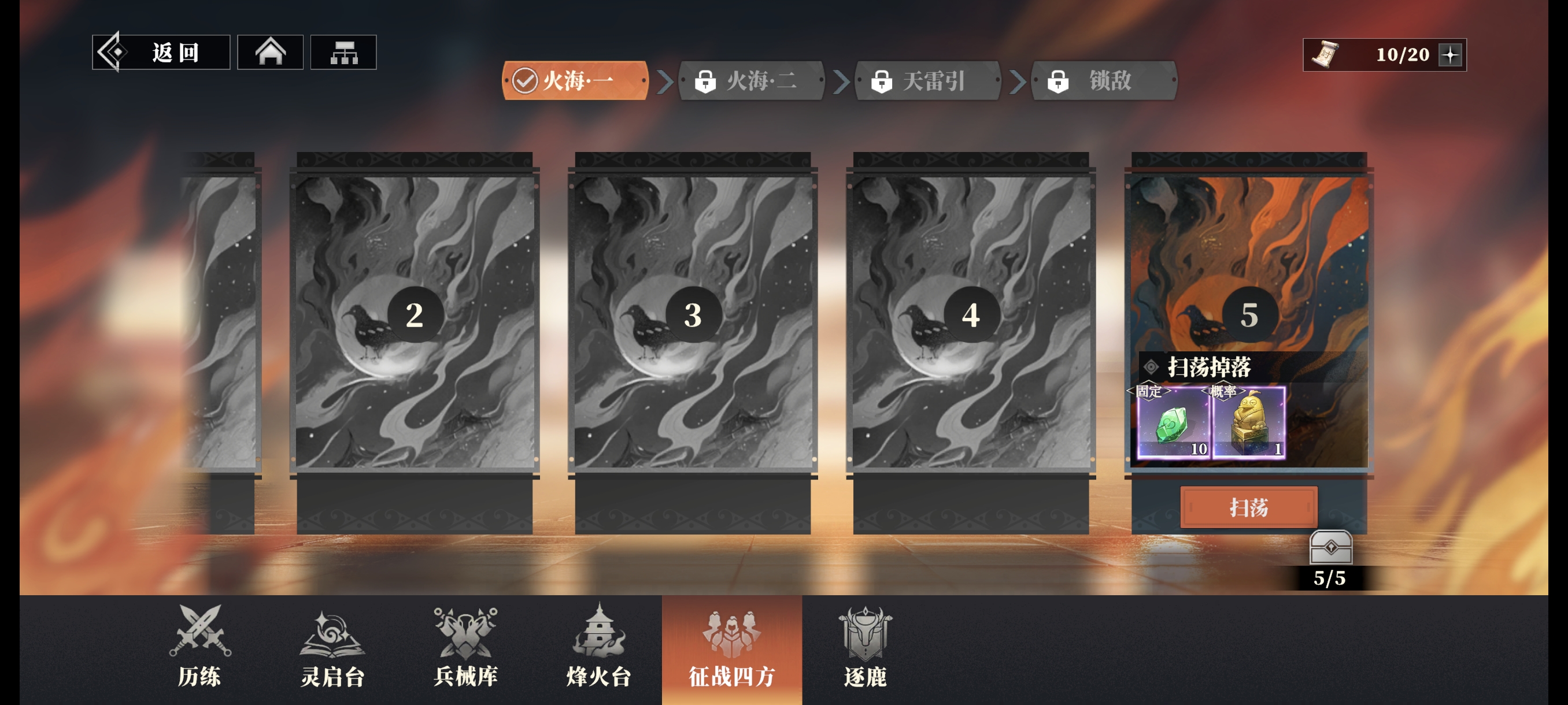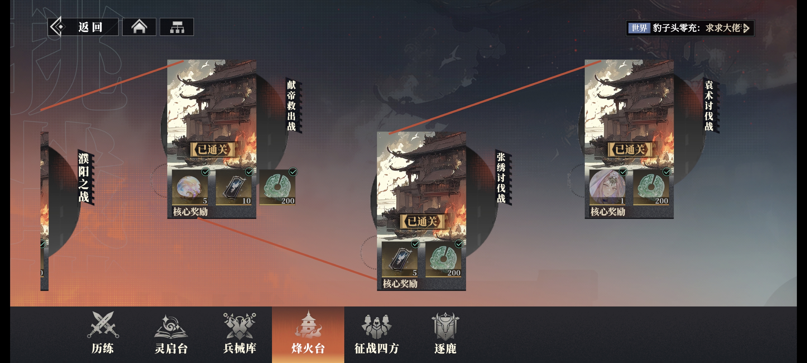 兵械库尽量往高打,提升一下装备品质和等级。然后开始挑战新解锁的征战四方副本。