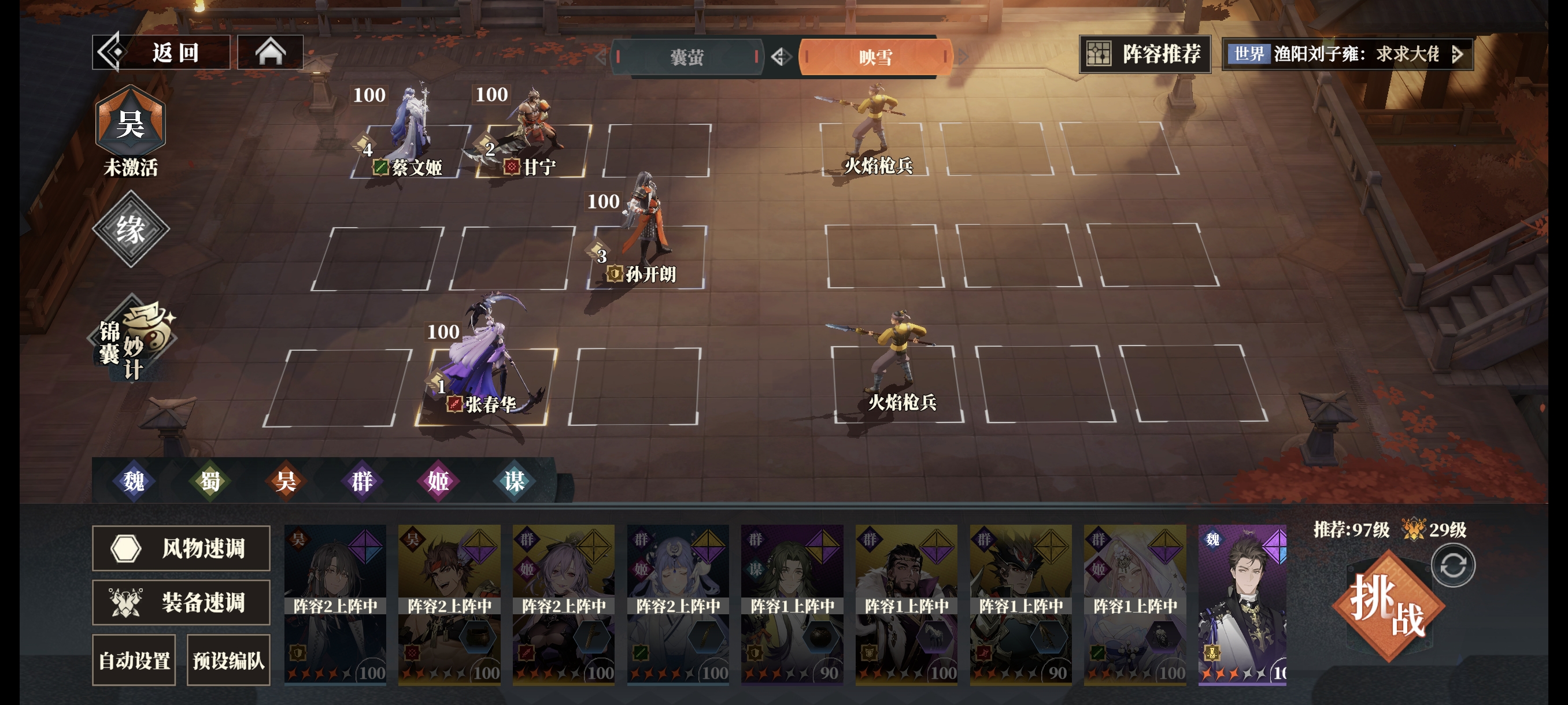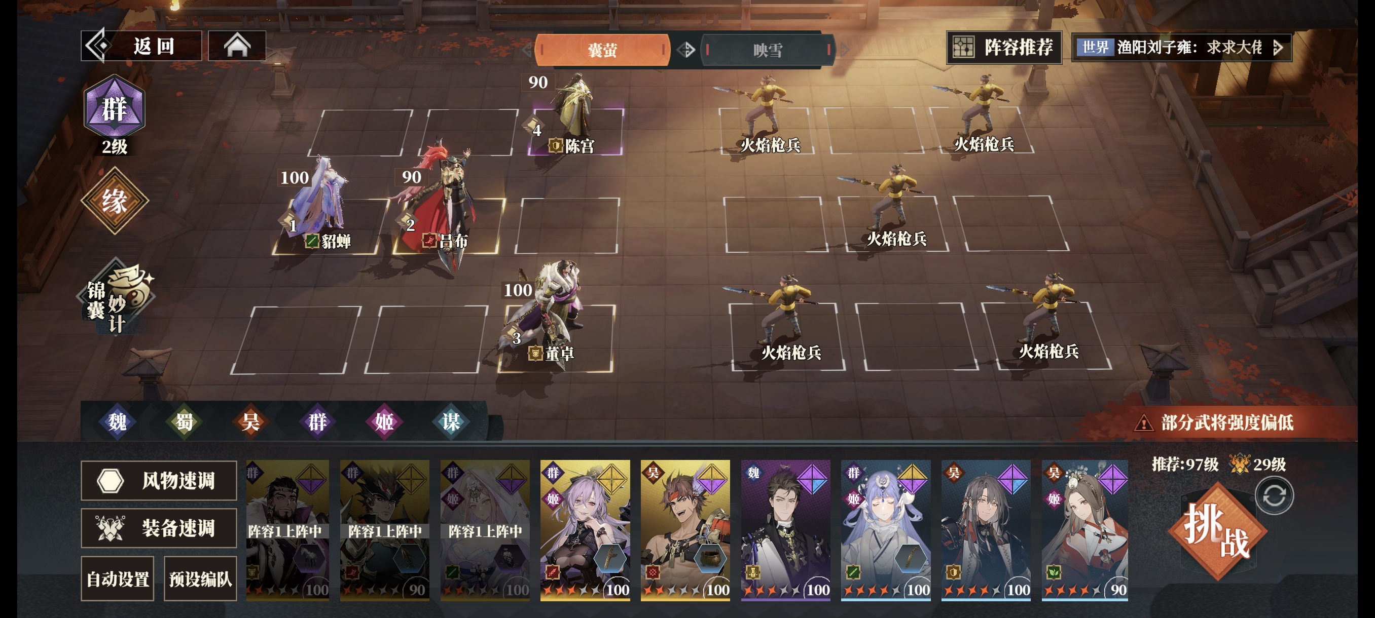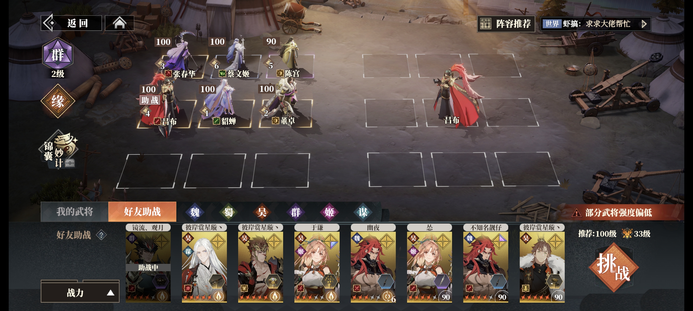 征战四方需要上阵两个4人队伍,这也是前期要练双C的原因之一。把吕布缘分4人组放在一队,张春华带上四小强去二队。
