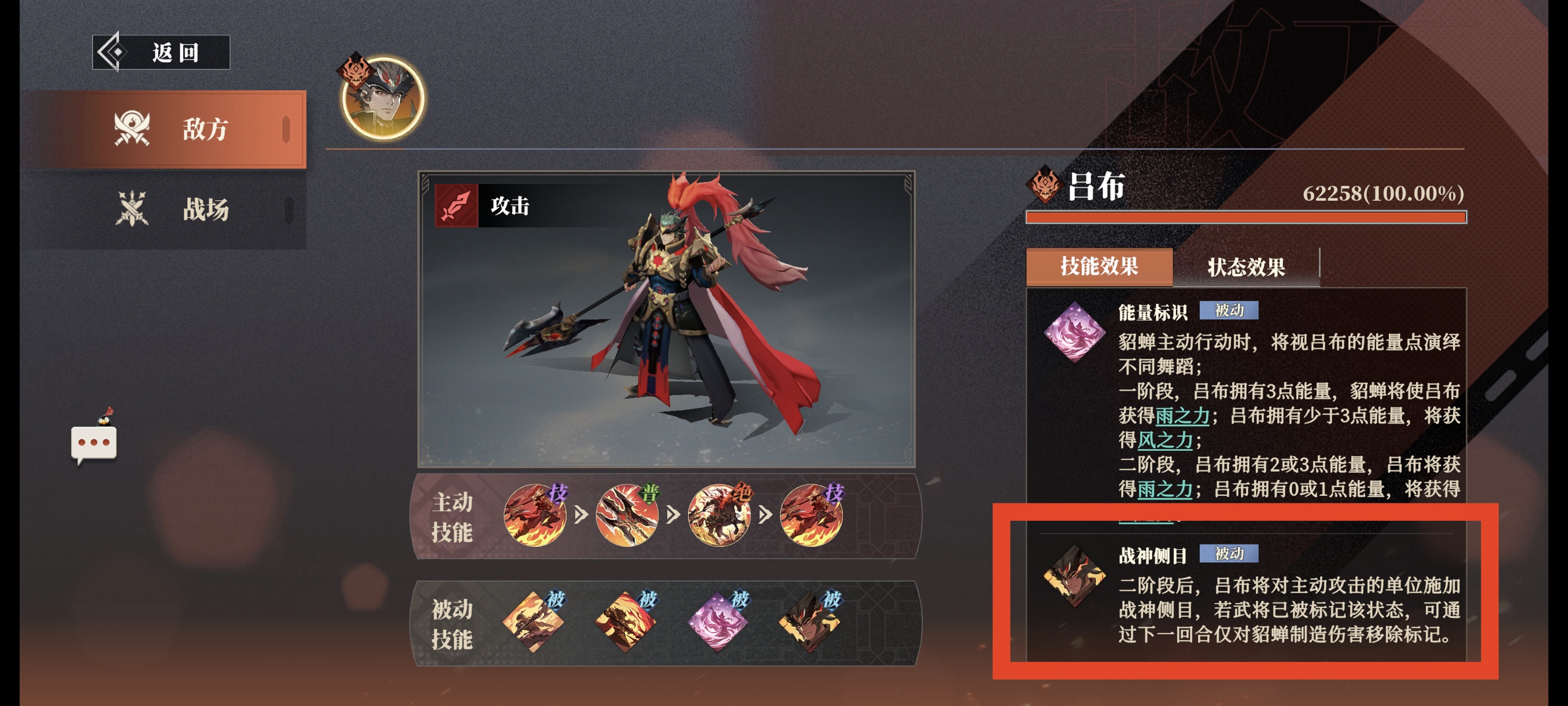 进入第二阶段后,同一武将不能连续攻击吕布2次,必须要通过转火打貂蝉来消除【战神侧目】,借大佬的吕布不用管这个,直接硬吃吕布伤害就行。