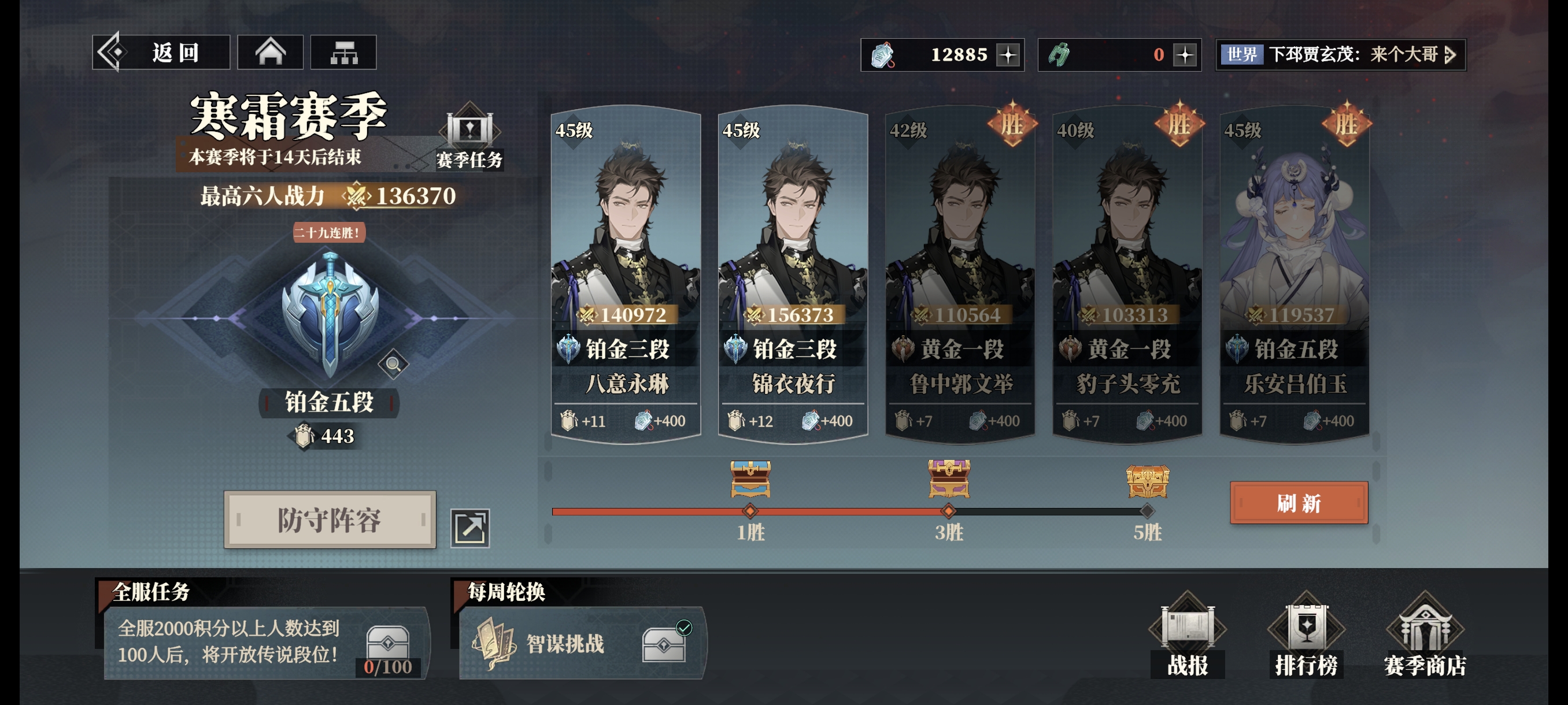 最后把爬塔打通,拿到白嫖的貂蝉成功升到3星,烽火战令奖励领满。竞技场次数打完,升到白金5段。