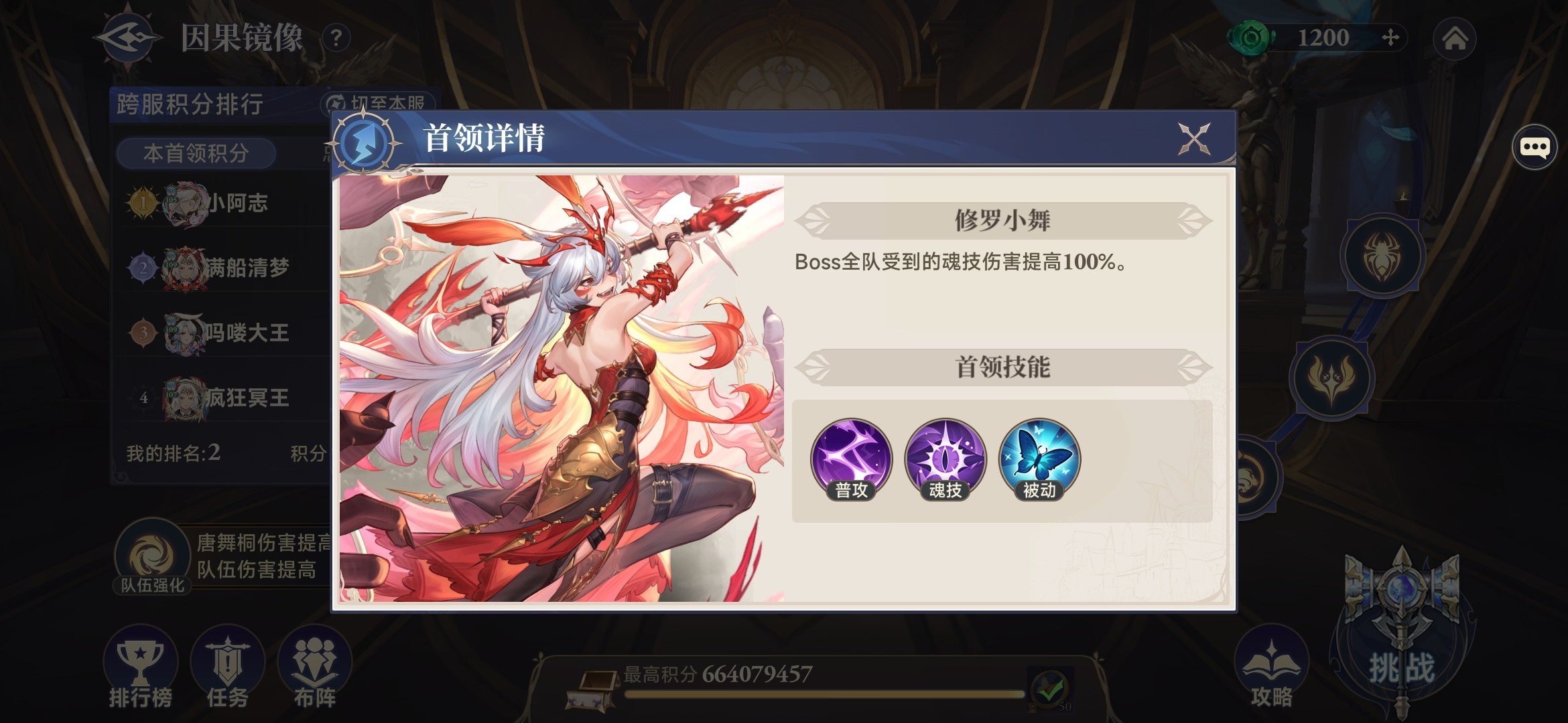 1.修罗小舞队伍由修罗小舞和5个普通怪组成,特点是:①普攻,对生命最低的敌人所在列,造成35%生命上限的真实伤害;②魂技,对生命最低的敌人所在列,造成50%生命上限的真实伤害;③被动,敌方全体受到的魂技伤害提高100%,修罗小舞每回合获得100连击值。