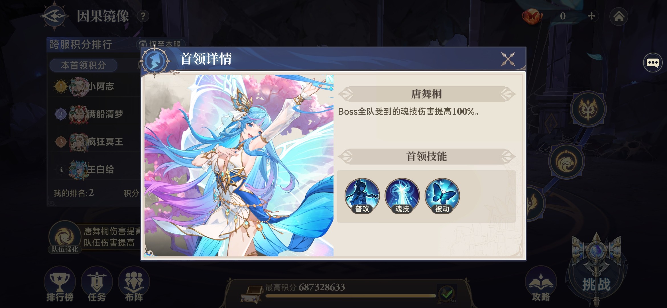 因果镜像秘境有两个首领怪,其中修罗小舞由单个队伍挑战,唐舞桐由两个队伍挑战。。