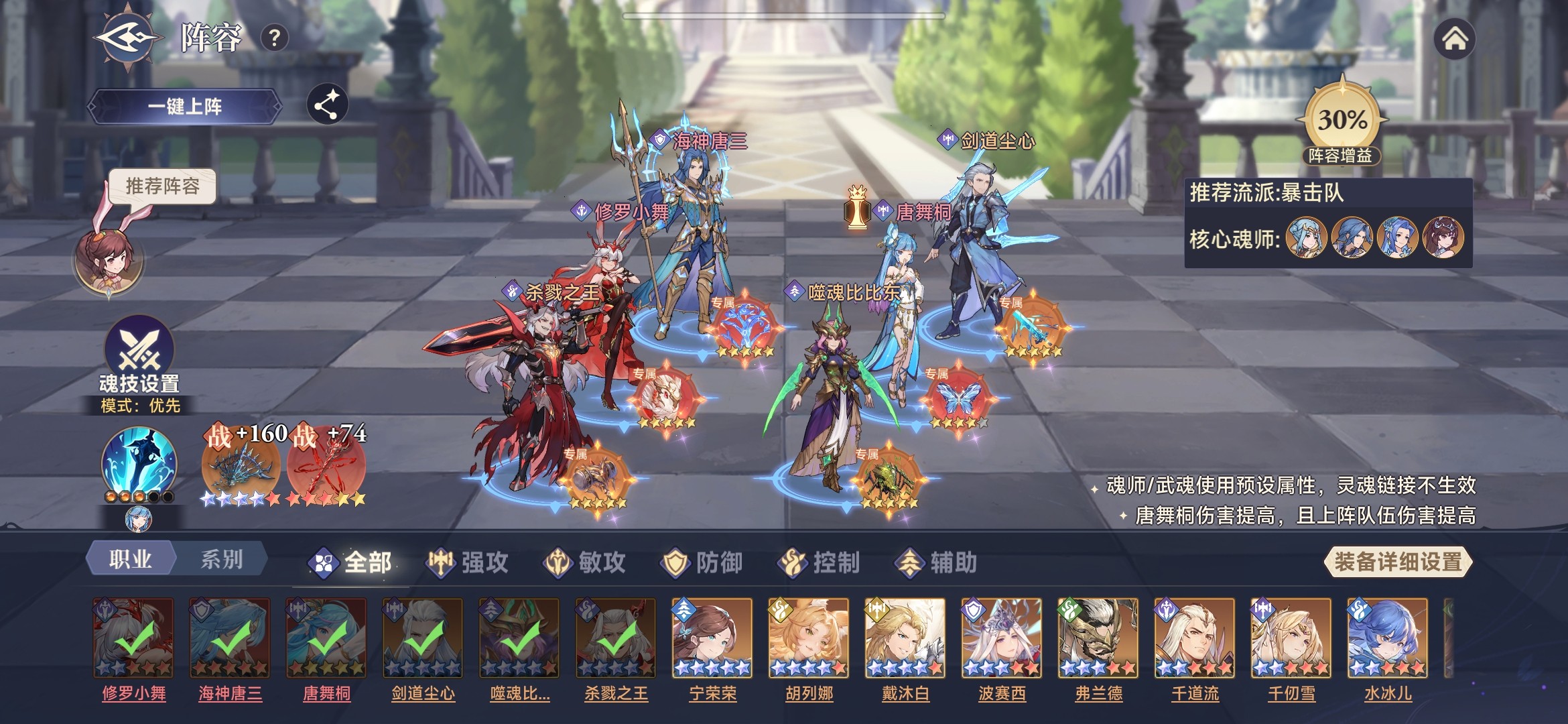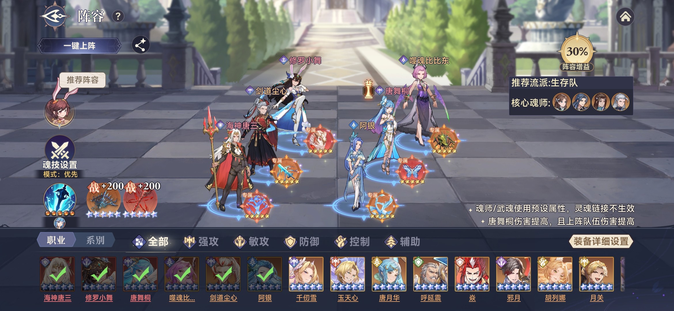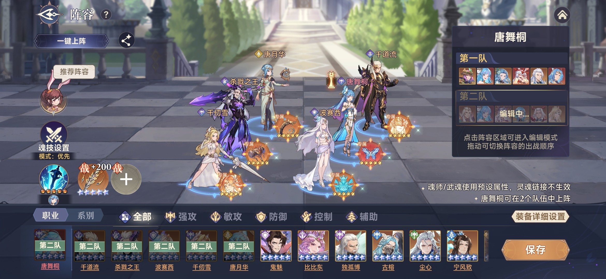 此时,唐舞桐基本功能都具备,拥有魂技伤害、光耀、生命流失、最终增减伤等效果。所以,采用三核队,唐舞桐、修罗小舞、剑道尘心作为核心输出,杀戮之王加增伤,噬魂比比东加时空魂力、海神唐三加护盾。参考阵容如下: