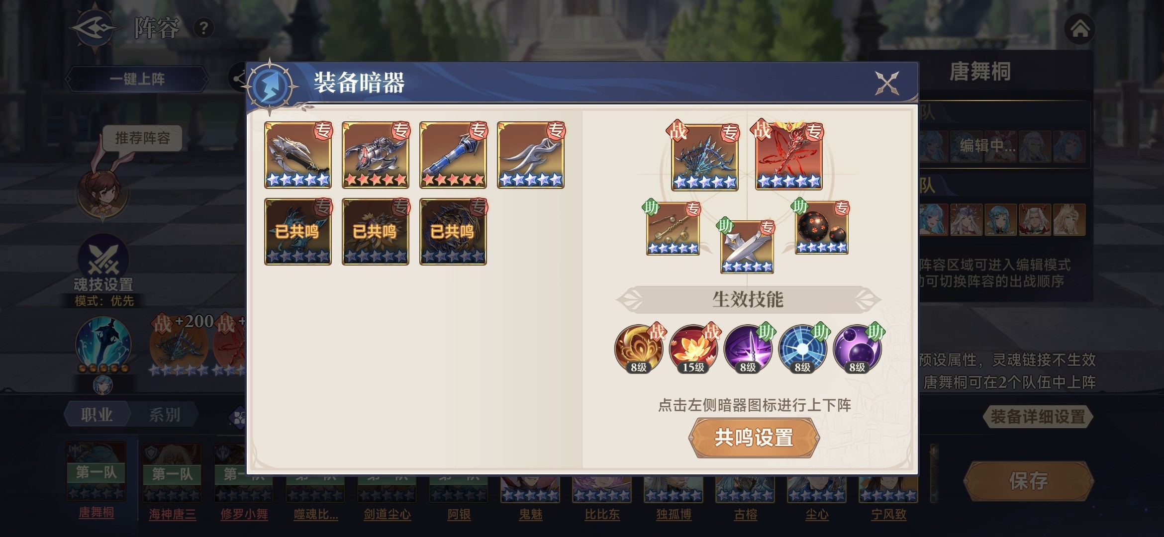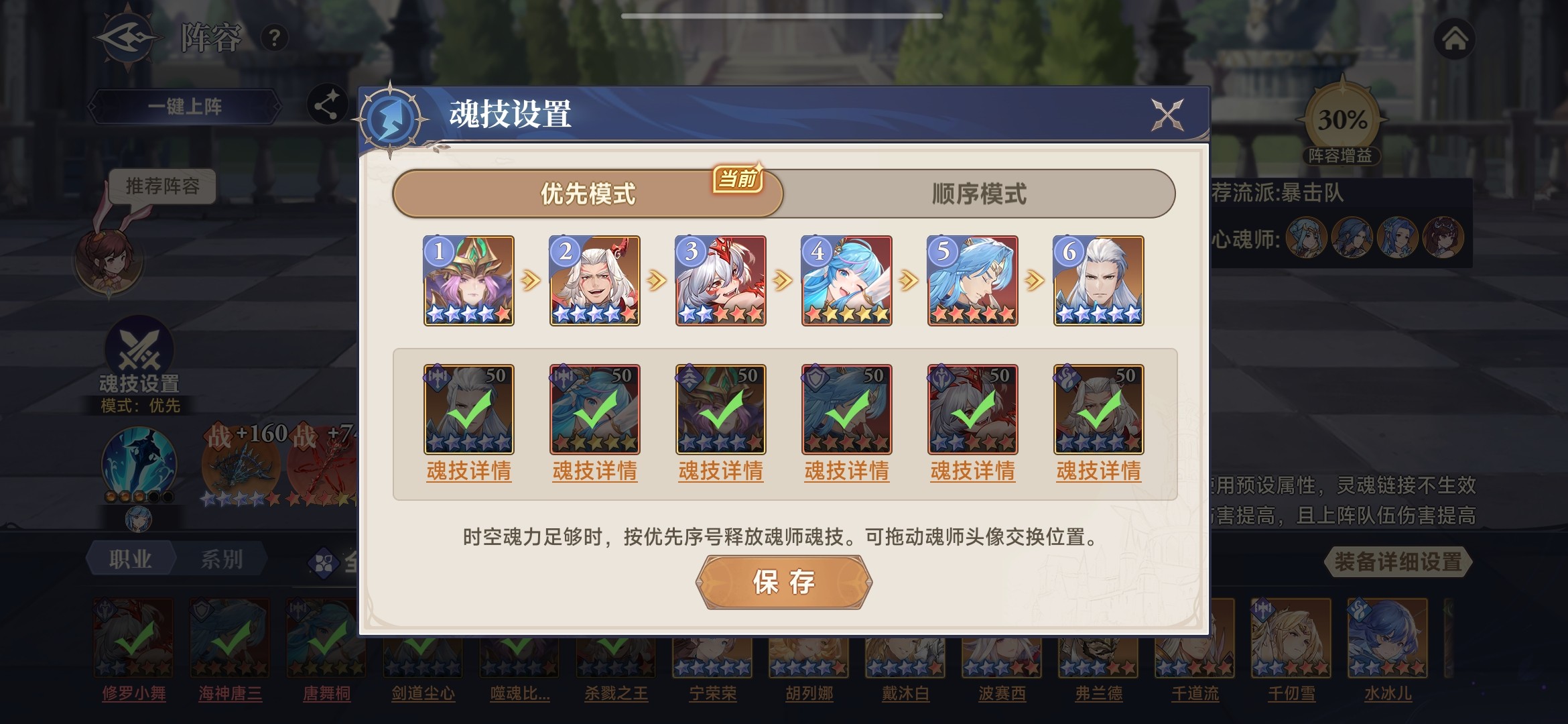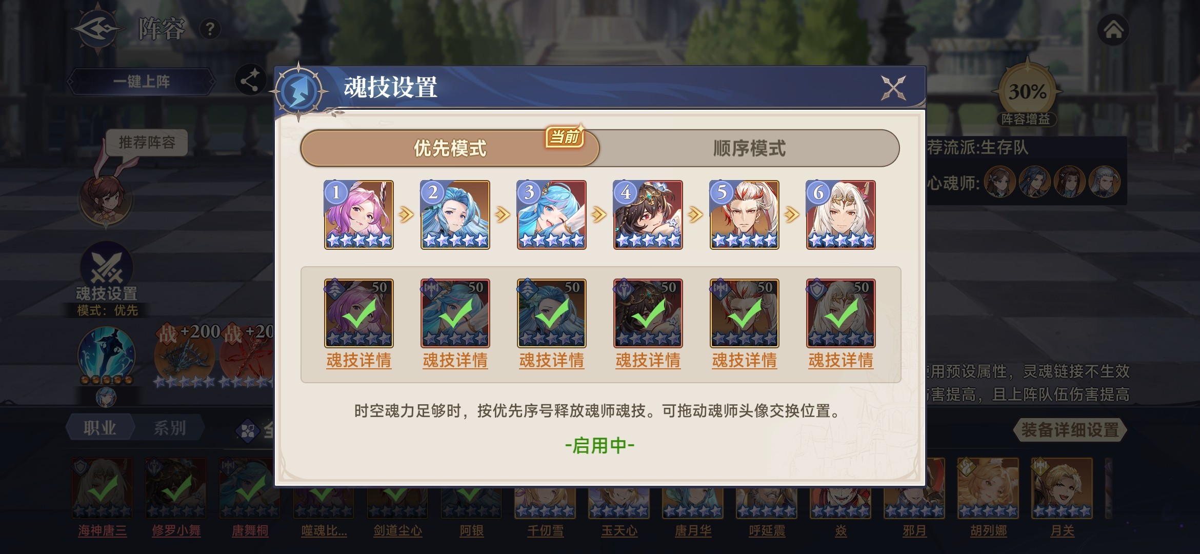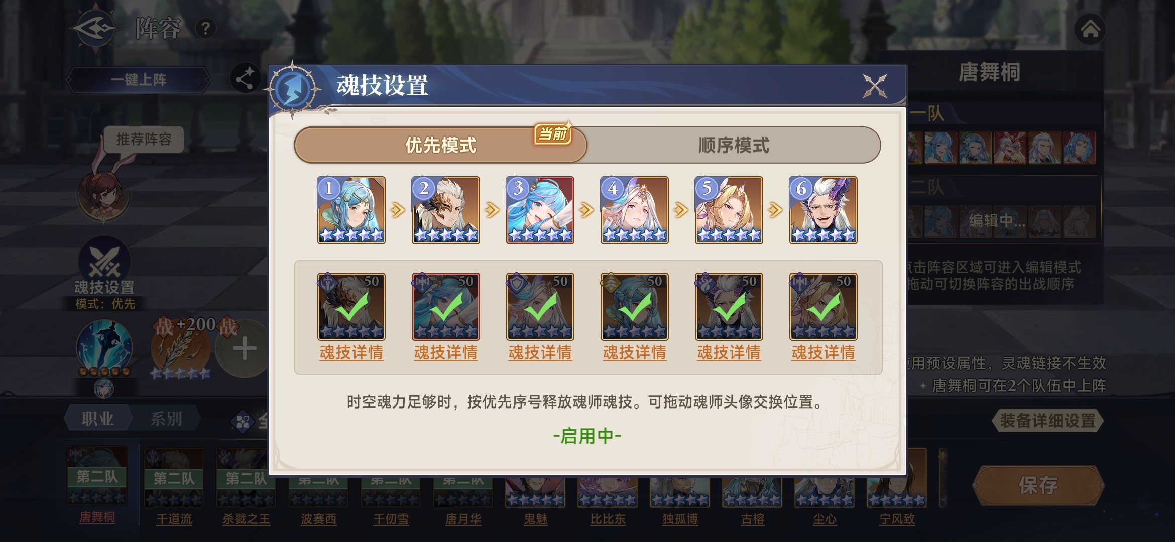 魂技释放顺序:采用优先模式,噬魂比比东、阿银、唐舞桐、修罗小舞分别居前4位,剑道尘心和海神唐三的魂技后置。