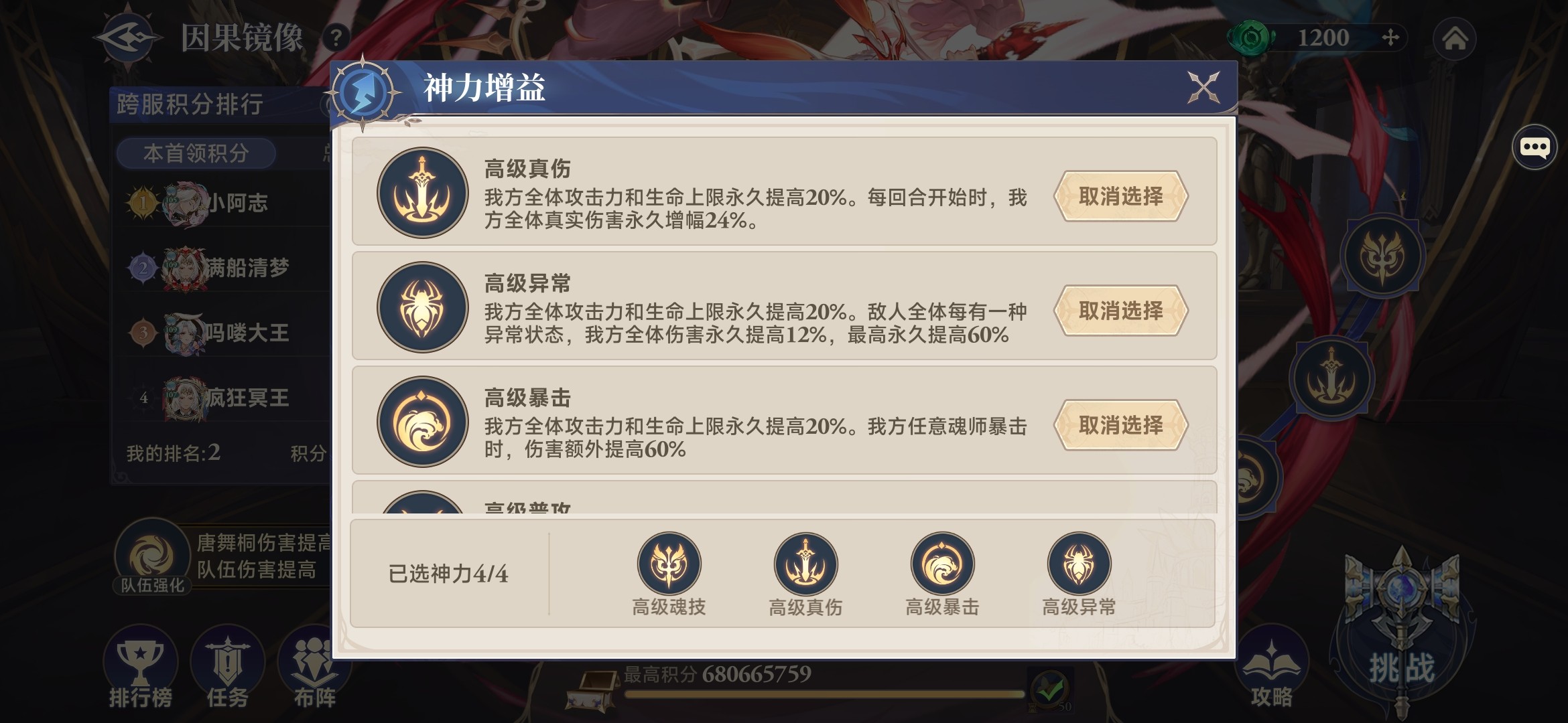 1.神力增益选择:高级暴击、高级魂技、高级真伤、高级异常