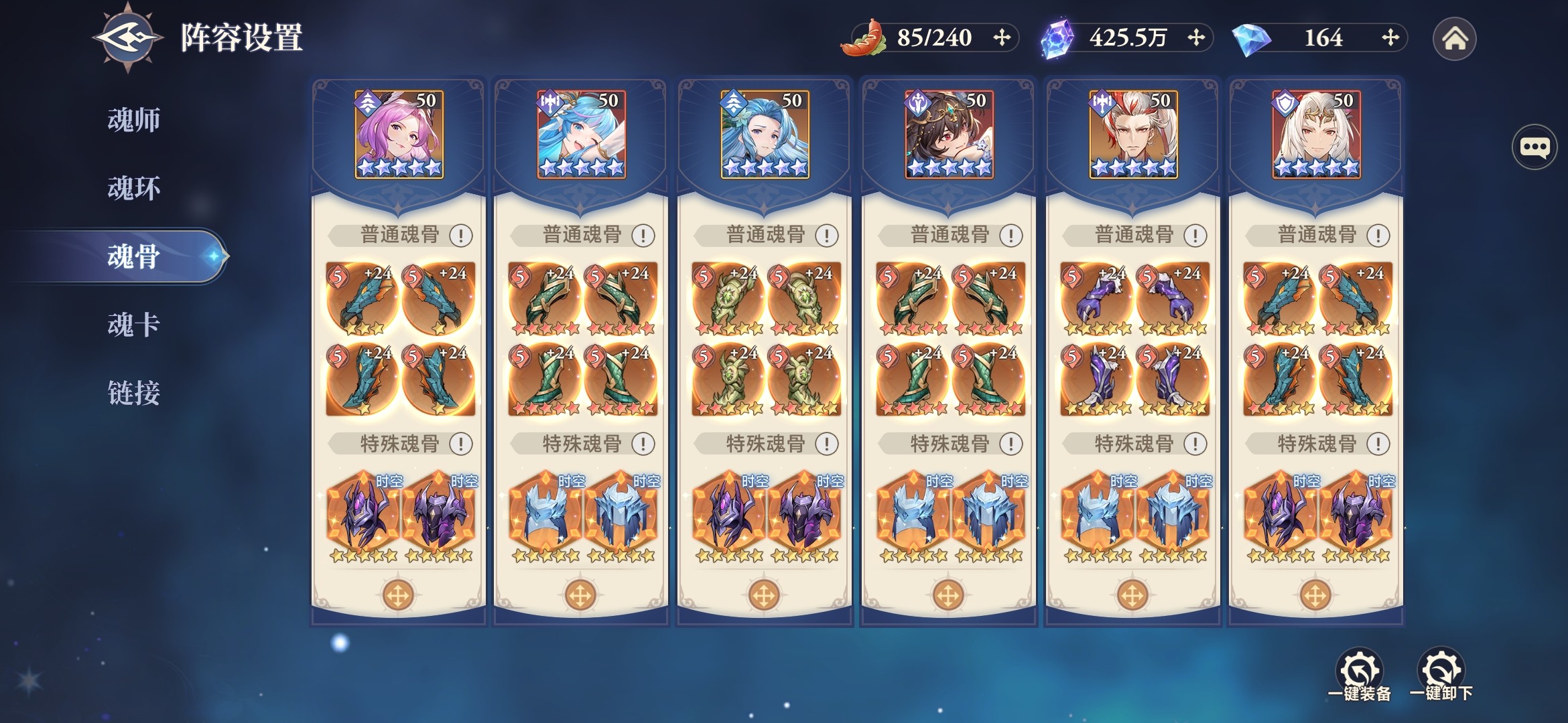 其他魂师的魂骨由系统推荐确定,外附魂骨都选择烈火杏娇疏,而时空魂师搭配时空外附魂骨—八角玄冰草、暗魔邪神虎,能够最大限度的为全体提供增伤和减伤。