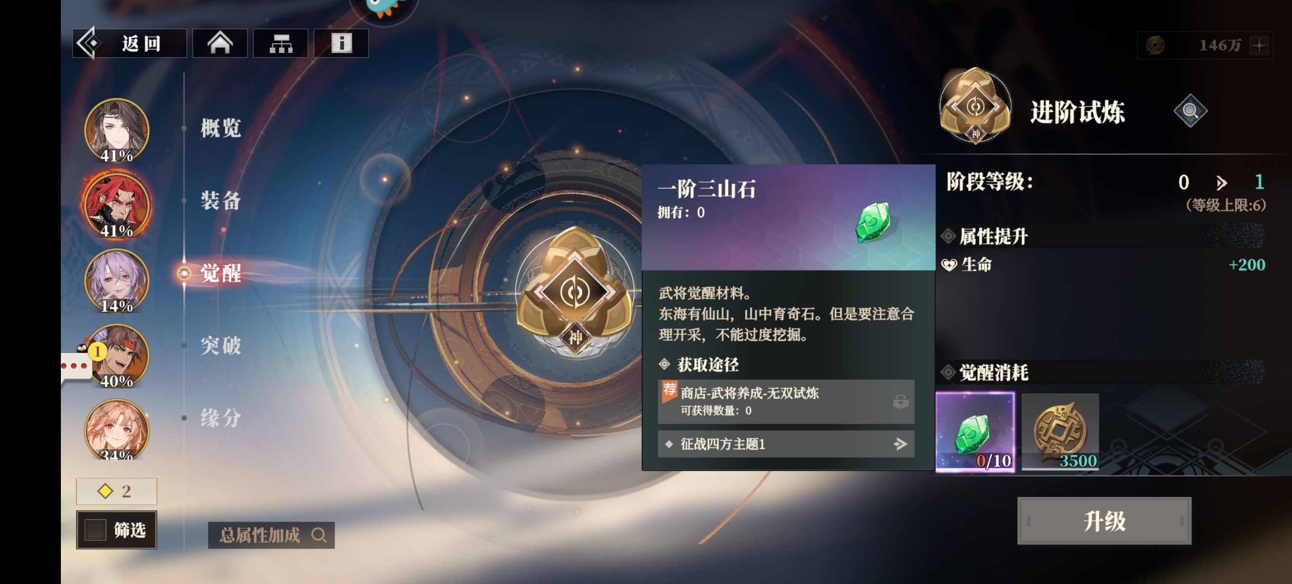如果苍岩石兑换了武将等级突破材料,那么我们的体力就可以优先分配在觉醒关卡,去刷觉醒副本。