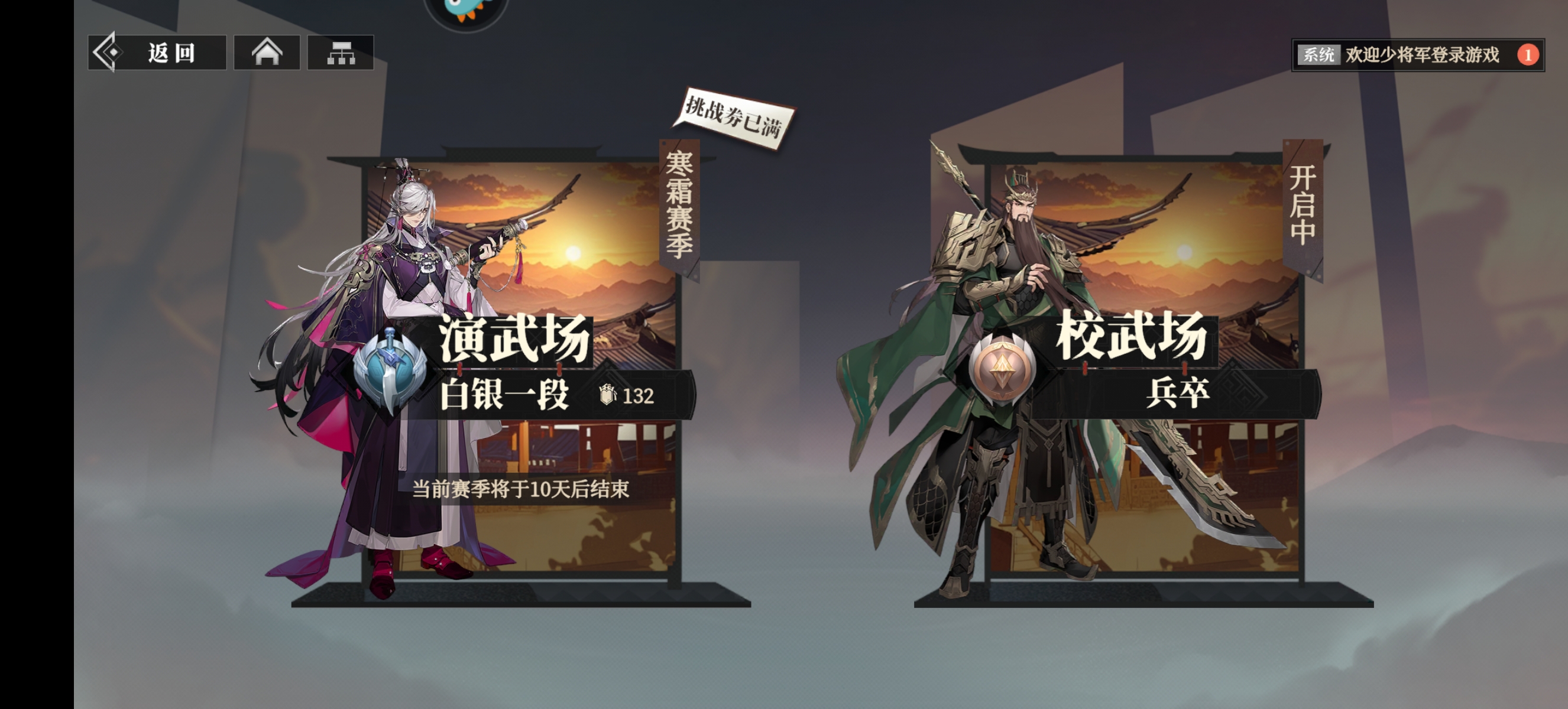 ⑥打校武场(每天固定时间开启,别忘了打,可以获得大量的苍岩石,平民玩家最少每天打赢3把,领取宝箱奖励,不过这个模式对0氪微氪平民玩家没有太大的优势,很难打到高段位,段位越高对手就越强)。