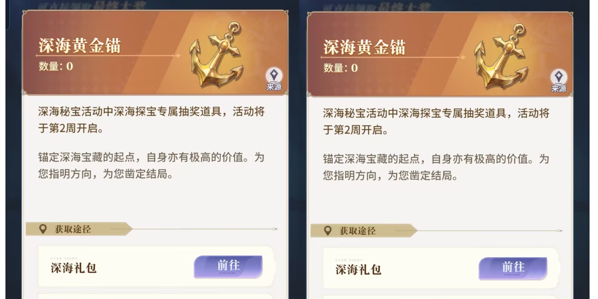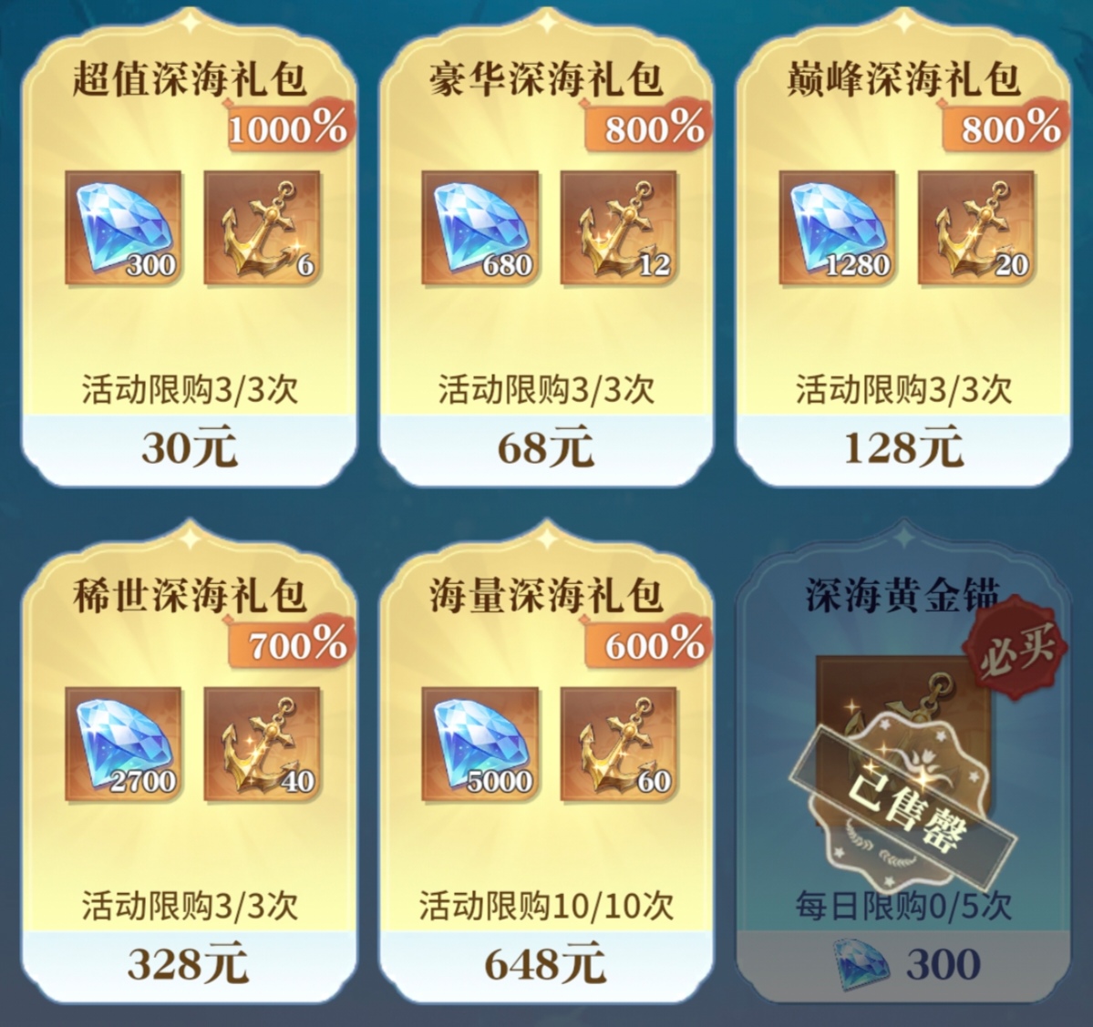 1:【深海礼包】里面的每天5次的黄金锚有没有必要吗?答:一定要买,不管你是平民玩家还是氪金大佬每天5个黄金锚一定要买。