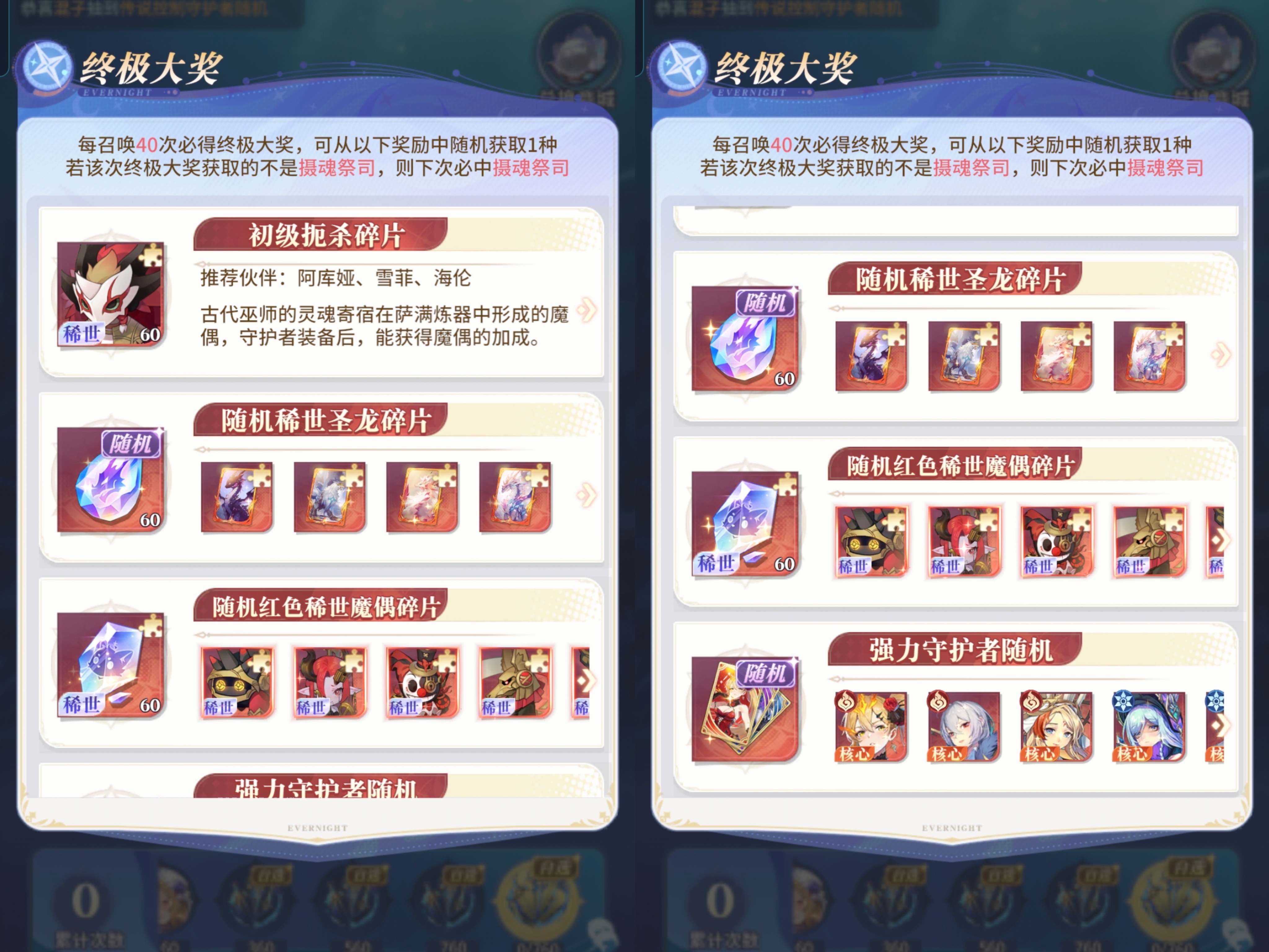 1:【终极大奖】一共有四种:①扼杀魔偶 ②随机圣龙碎片 ③随机红色魔偶 ④核心输出守护者自选。