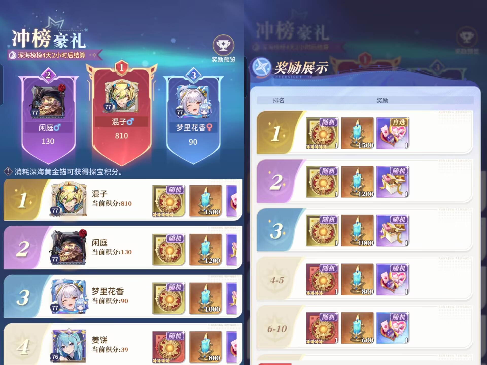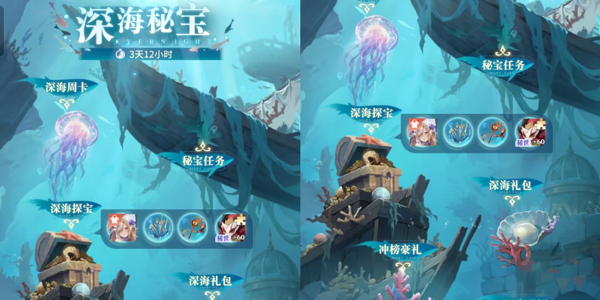 一:【深海秘宝】大家关注的问题。活动分为五大板块:深海周卡、秘宝任务、深海探宝、深海礼包、冲榜豪礼、深海赐福。