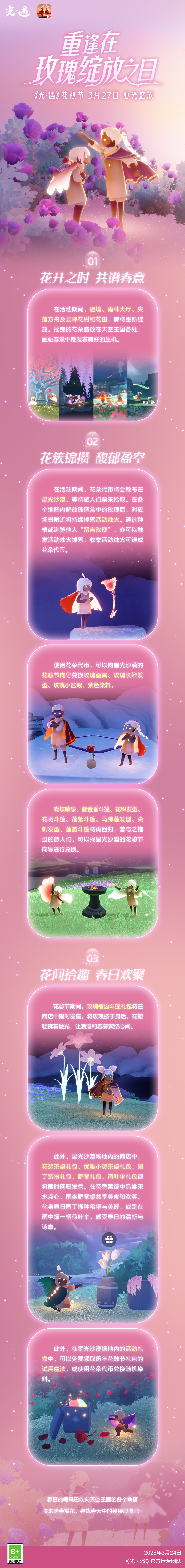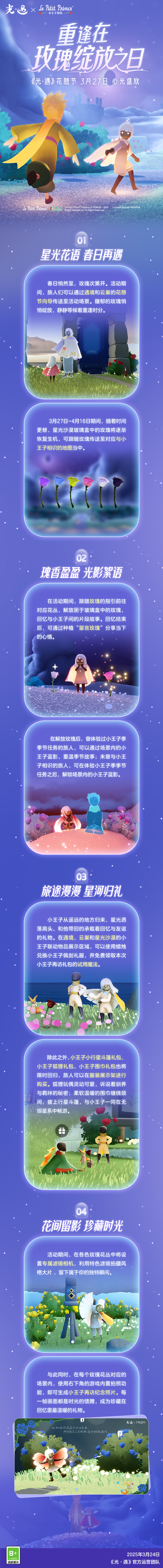 《光·遇》 ×《小王子》再访更新内容公告是泽哦发布于 2025-03-24关注再遇旧友共赏玫瑰初绽 笑语盈盈情谊如花盛放 👑 《光·遇》 ×《小王子》再访活动将于3月27日开启 请旅人们仔细阅读更新公告,了解更多活动信息 🌟 重逢在星光轻抚的花丛中 3月27日更新结束后 ~ 4月16日23:59 让相聚的时光染上馨香吧