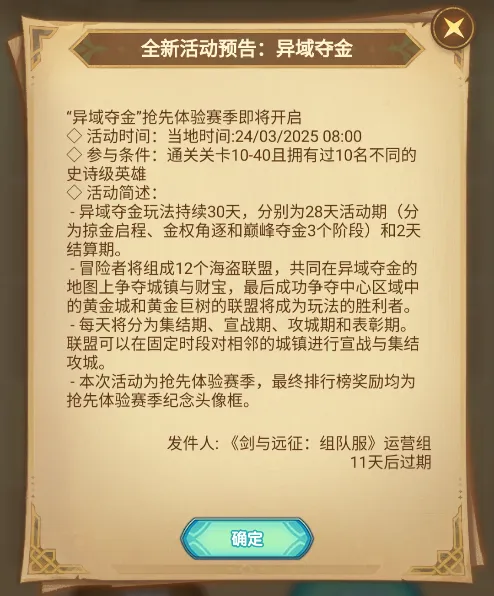 1.本次异域夺金活动为抢鲜体验赛季,根据您的参与程度有进程奖励,不设排名奖励,可能存在部分体验问题,还望积极体验与反馈,帮助我们完善新活动。