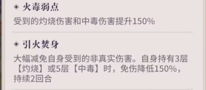①引火焚身会大幅度减少:受到的非真伤,但是灼烧和毒伤叠到5层,首领会降低150%伤害减免。