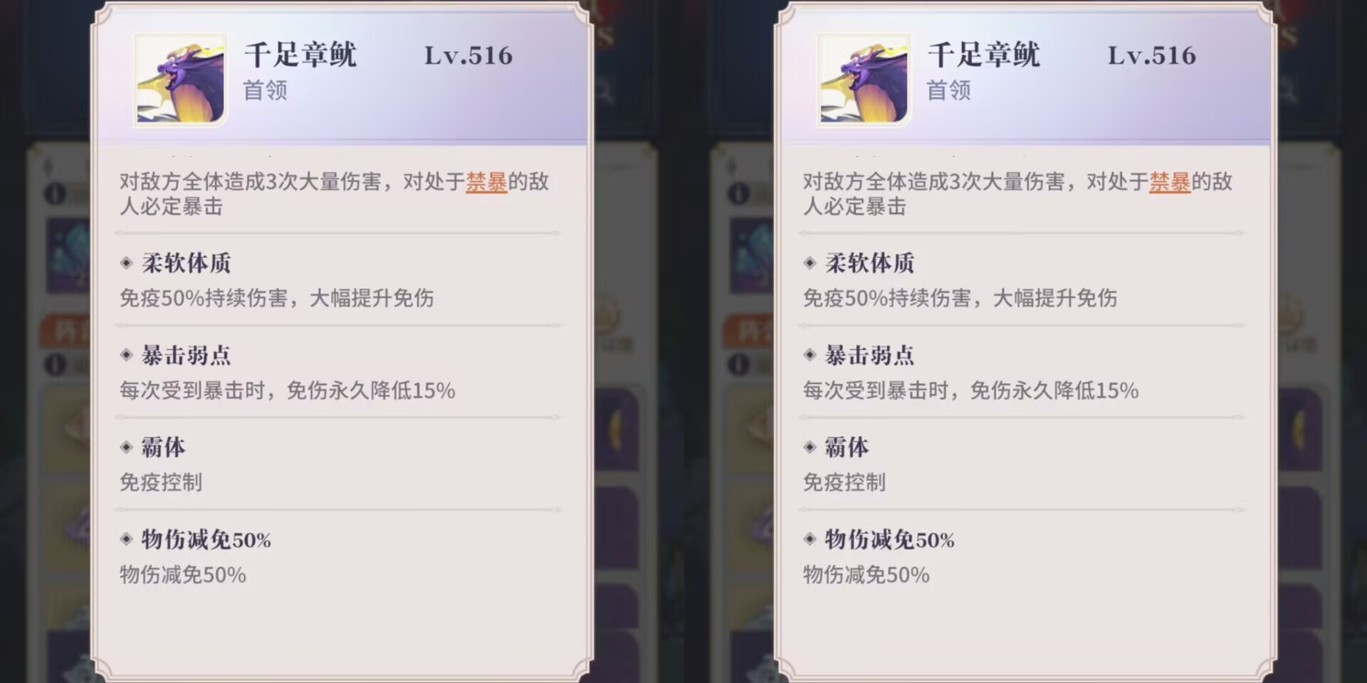 ①柔软体质:免疫50%持续伤害(所以我们的灼烧队和毒伤队在这个模式下没有优势了)