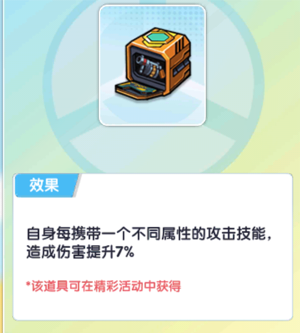 新版本的这个道具适合多种类攻击招式精灵使用,就比如说我在上个文章里面讲到的火暴兽,只要这个精灵使用的攻击类型属性越多,那么这个道具带来的加伤就越多,最高可以提升28%保底的话,也就是14%的输出额外增加,其实这个道具看起来的话,使用面比较的窄,它只适合那种一个变化,三个攻击招式或者是四个攻击招式,利用特性回血或者是增加能力的精灵使用,如果非得要依靠两种变化和两种攻击属性,招式才能够运转的起来的精灵使用该道具的性价比还不如火把,所以说这个道具我个人感觉就是个鸡肋,现在看起来的话一点用处都没有,如果使用四个攻击技能,那还不如使用疯狂面具呢,毕竟能用四个攻击招式的宠物,大部分都有这么一种情况,就是可以利用特性带来各种能力的提升,但是缺点就是没有回血而疯狂,面具可以补充,没有回血的情况,但是你这个就不行了,但是如果特性能回血,使用四个攻击招式的宠物,可以考虑该道具。