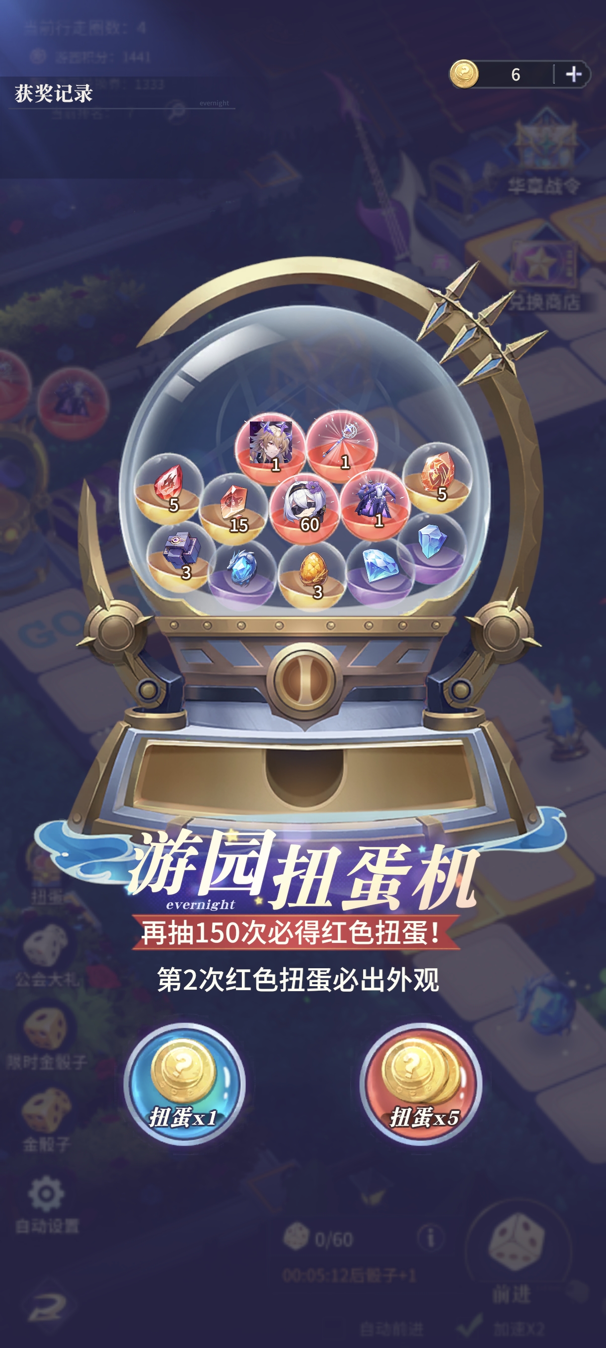 通过跑完整圈或魔镜穿越获得的扭蛋币,可以在扭蛋机中进行抽奖,可获得莱昂限定皮肤、追斩魔偶等奖励,每150次保底出红色奖品,300次保底出限定皮肤。一、满月游园会整个满月活动最主要的活动,是一个大富翁式的走格子拿奖励的玩法。每次丢骰子就会向前走点数步,每次行动都有奖励,即使是空格也有保底的游园积分和游园券。