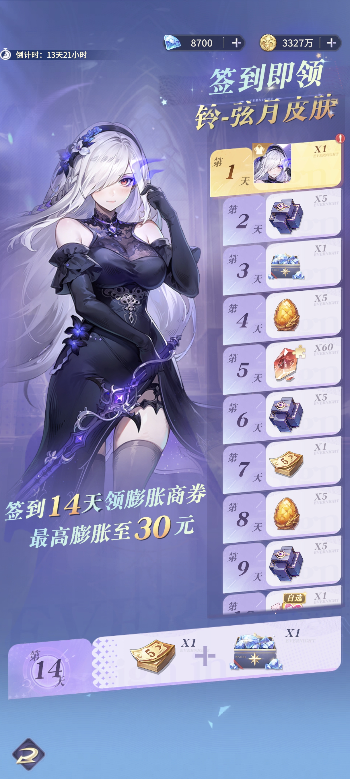 14天签到活动,共计可获得:铃限定皮肤+随机红魔偶+膨胀商券+20魔偶抽+15圣龙抽等奖励。