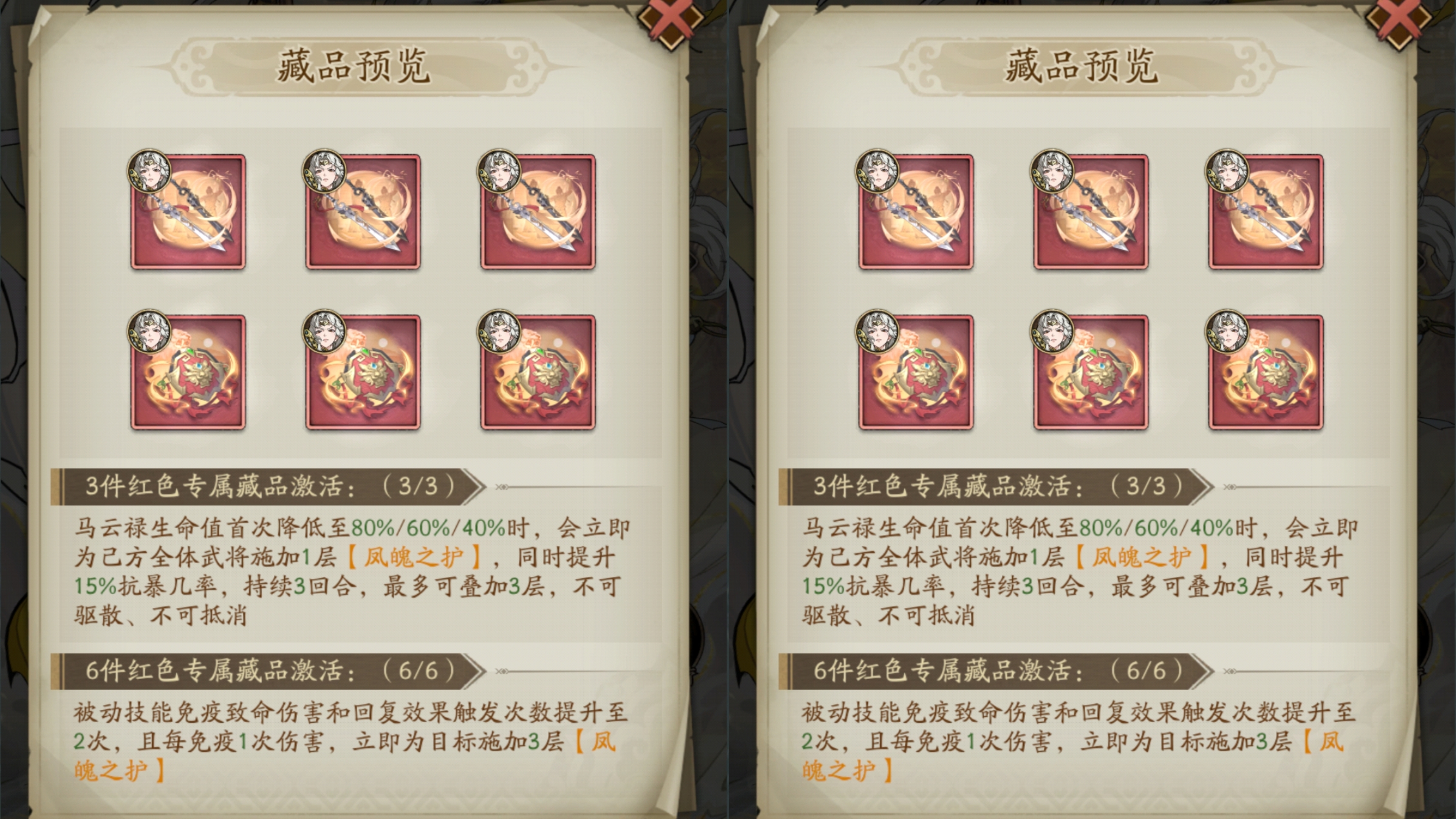 藏品6件套进一步加强马云禄的保护能力和保命能力。
