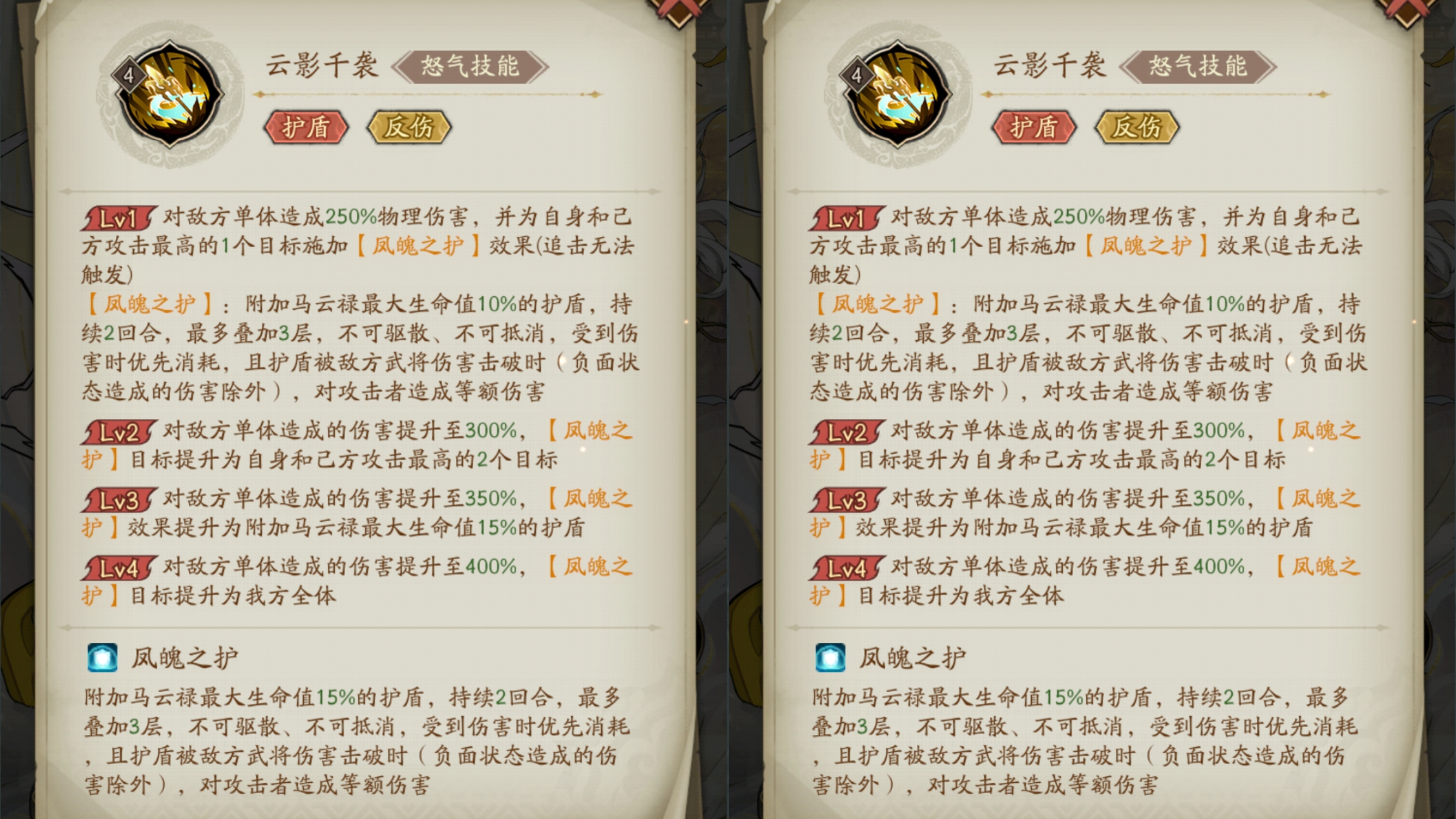+30:加强马云禄【风魄之护】的效果,每回合开始马云禄会给自己和我方生命最低的目标施加1层【风魄之护】。